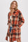 A plaid print long shirt jacket with a collared neckline, button front closure, two front chest pockets and two side pockets.