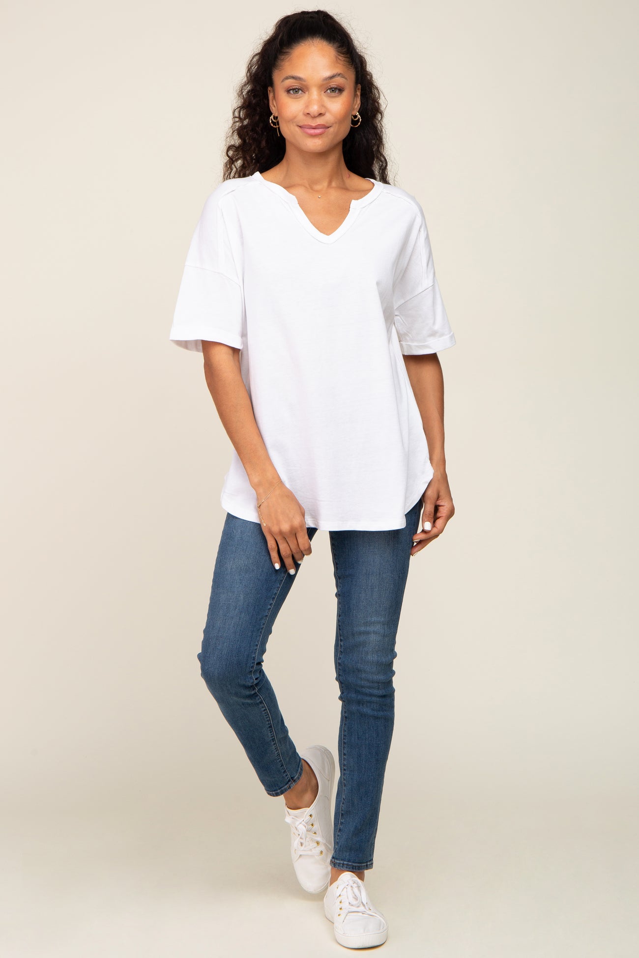 White Oversized V-Neck Cuffed Short Sleeve Tee