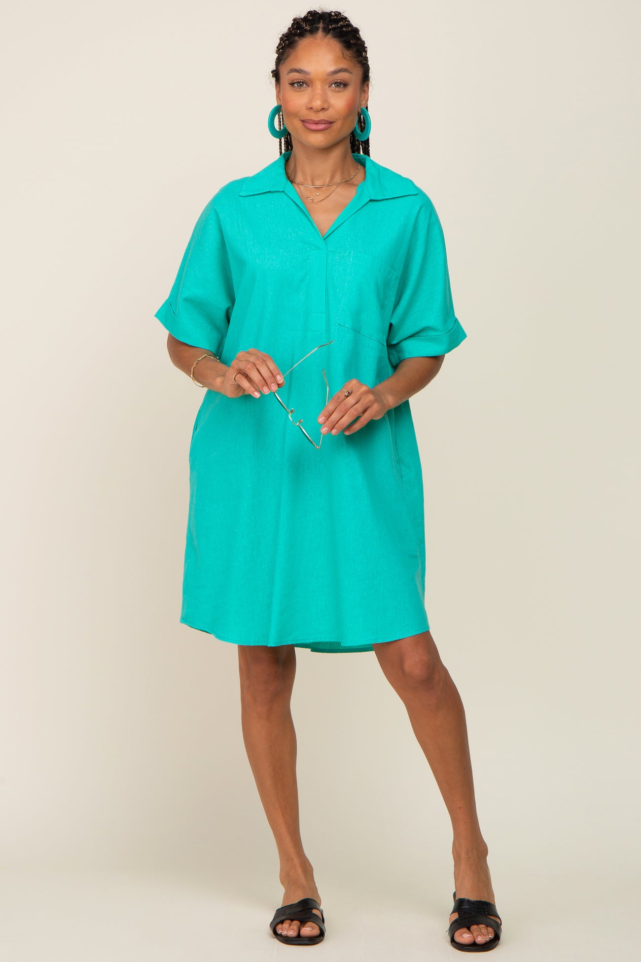 Aqua Linen Collared Front Pocket Short Sleeve Maternity Dress