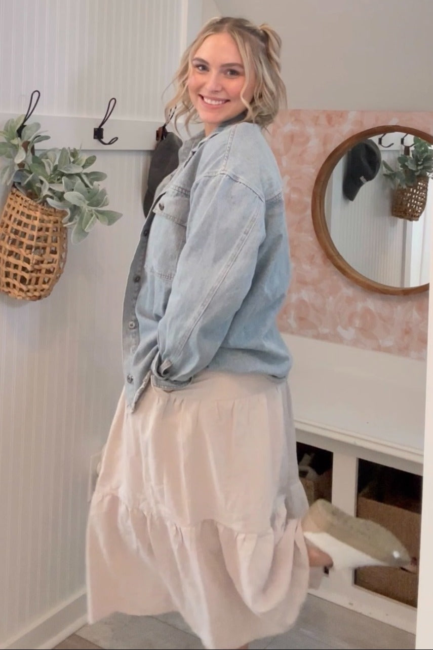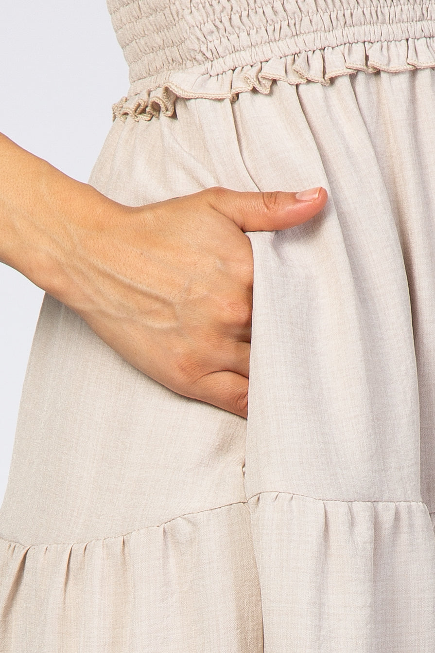 A solid midi dress featuring smocked bust, self tie bow straps and tiered skirt. Skirt is double lined.