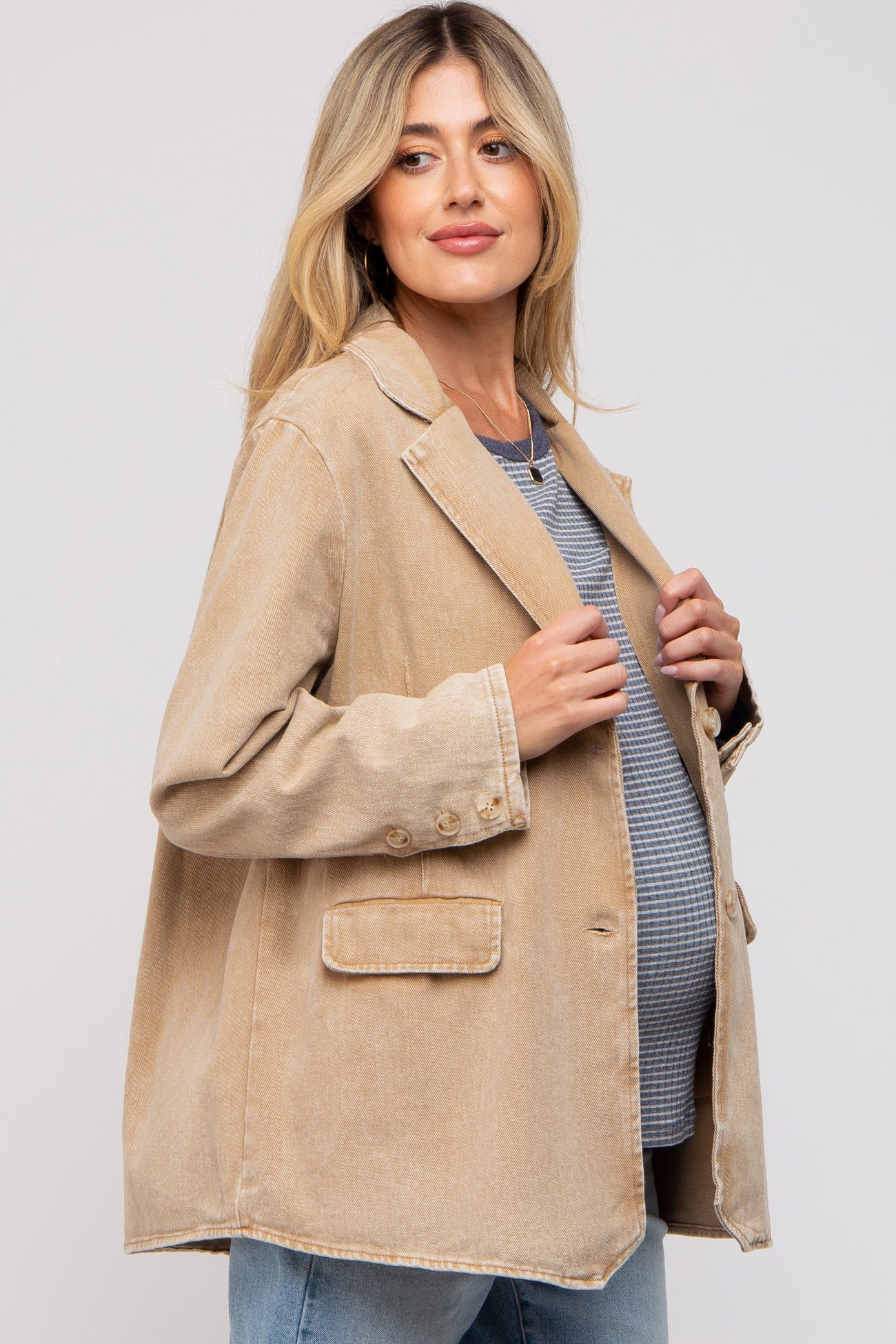 A denim maternity blazer featuring a notched lapel, two front pockets, front button closure, and long sleeves with buttons.