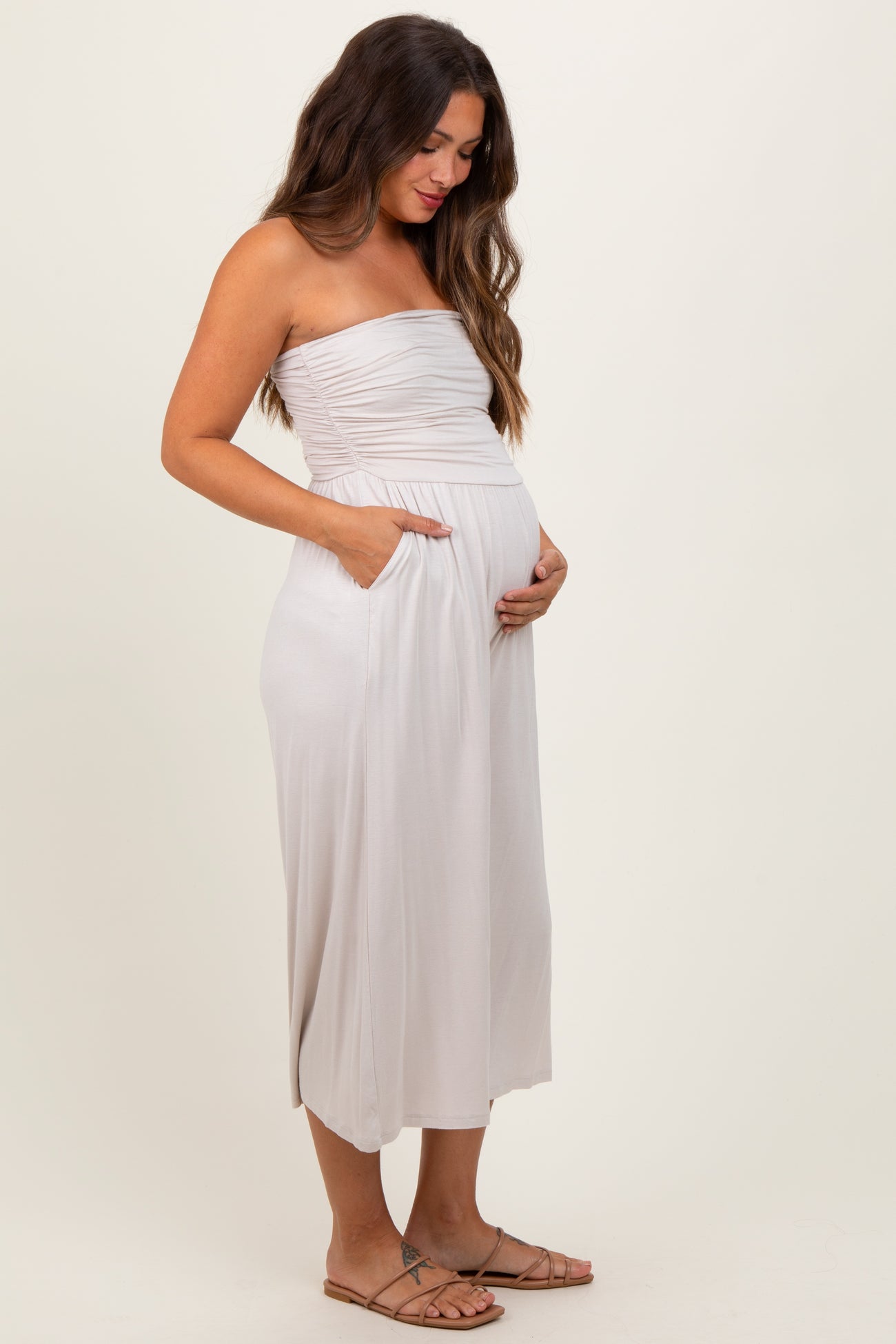 Beige Double Layered Strapless Tube Top Maternity Jumpsuit