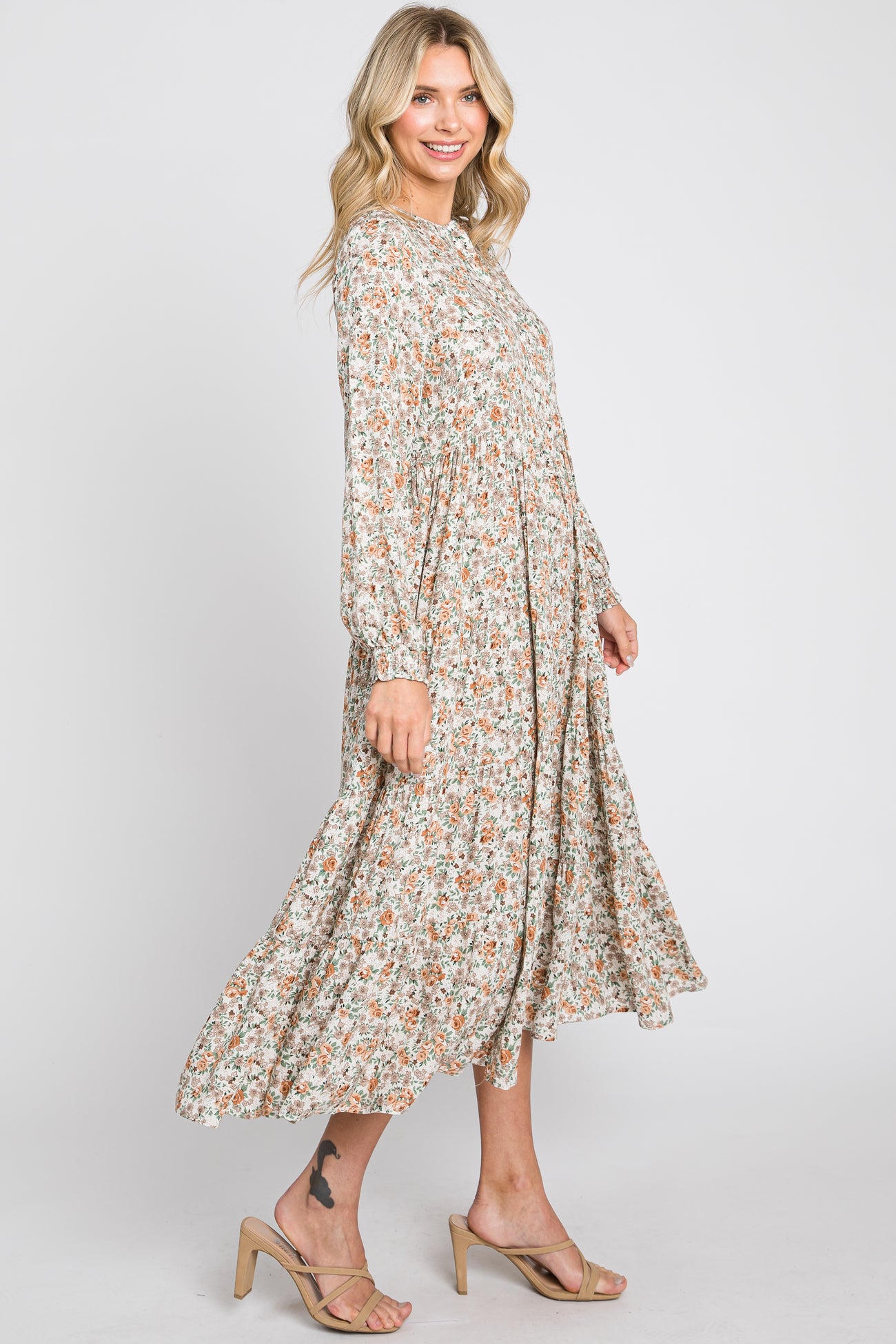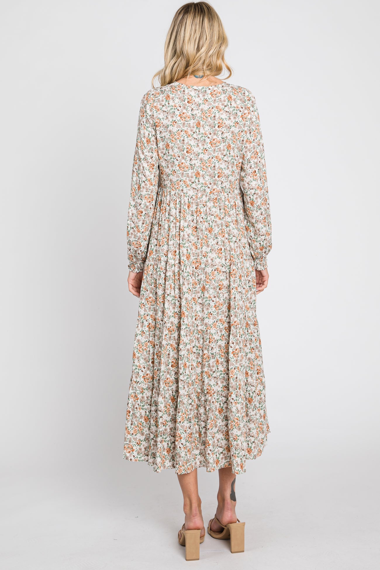 Beige Floral Button Front Long Sleeve Tiered Midi Dress