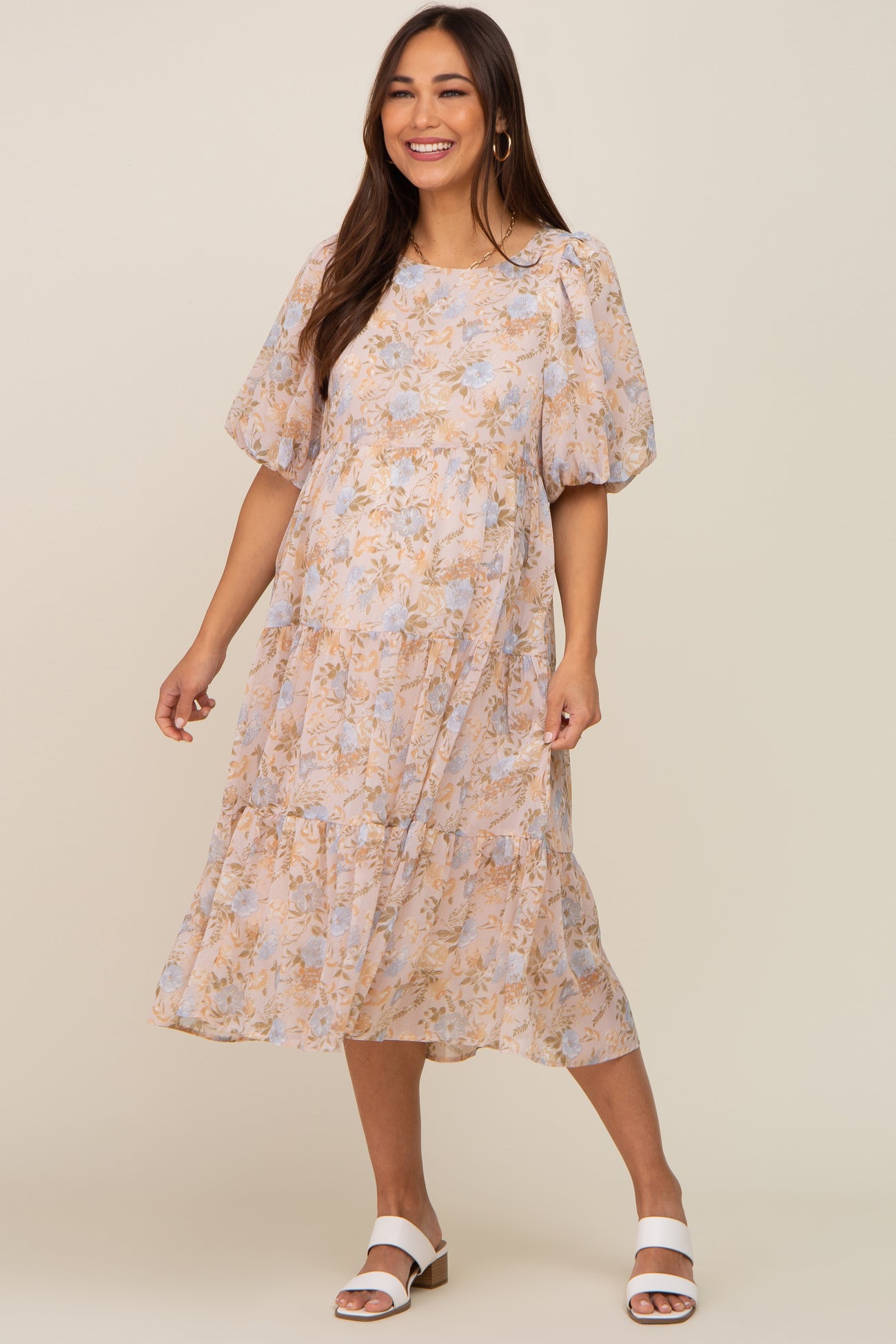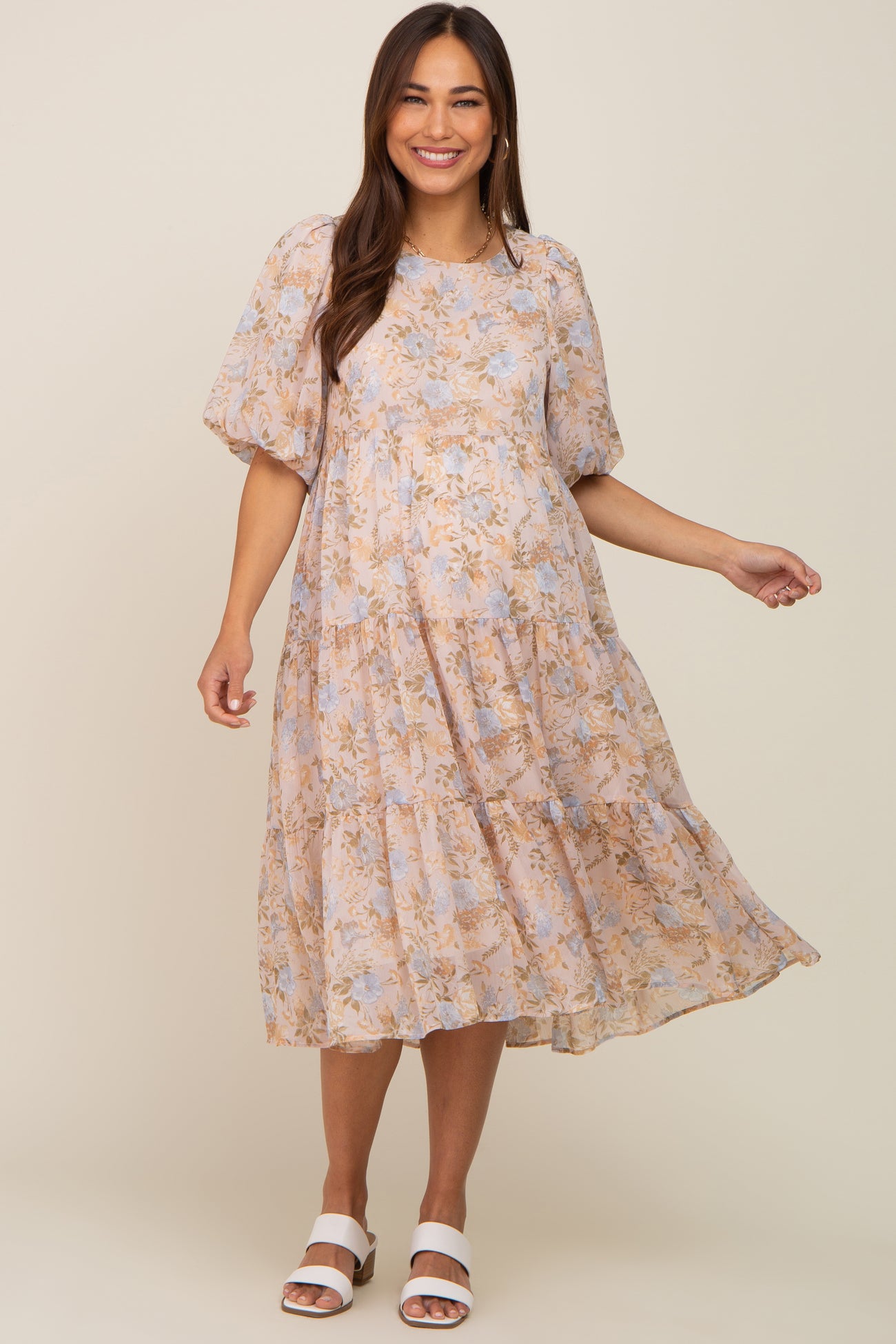 Beige Floral Chiffon Puff Short Sleeve Tiered Maternity Midi Dress