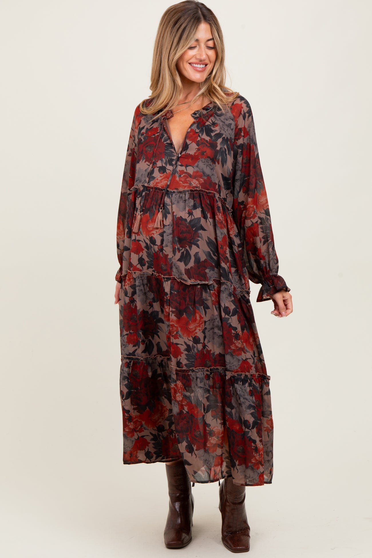 Beige Floral Chiffon Ruffle Tiered Maternity Midi Dress