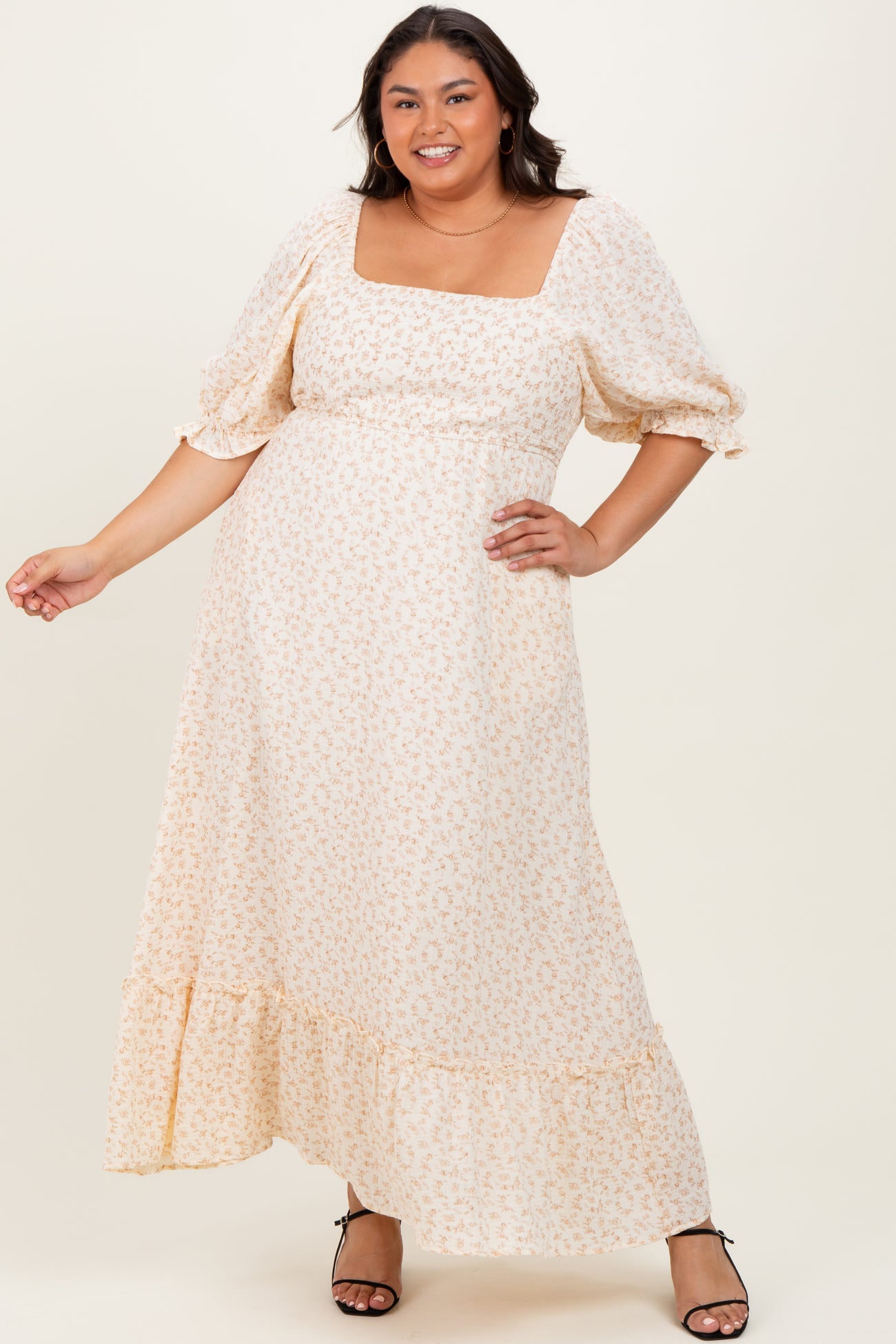 Embrace timeless elegance with our Beige Floral Print Plus Maxi Dress, designed to flatter every curve. Featuring a chic square neckline and romantic puff sleeves with delicate ruffled cuffs, this dress highlights your neckline and adds a touch of vintage charm. The soft beige fabric is adorned with dainty floral prints, creating a dreamy, feminine look. The empire waist and flowing maxi skirt with a subtle ruffle hem provide comfort and effortless style for any occasion. Pair it with your favorite sandals or heels for a perfect daytime or evening look. Available in plus sizes for a flawless fit.