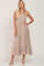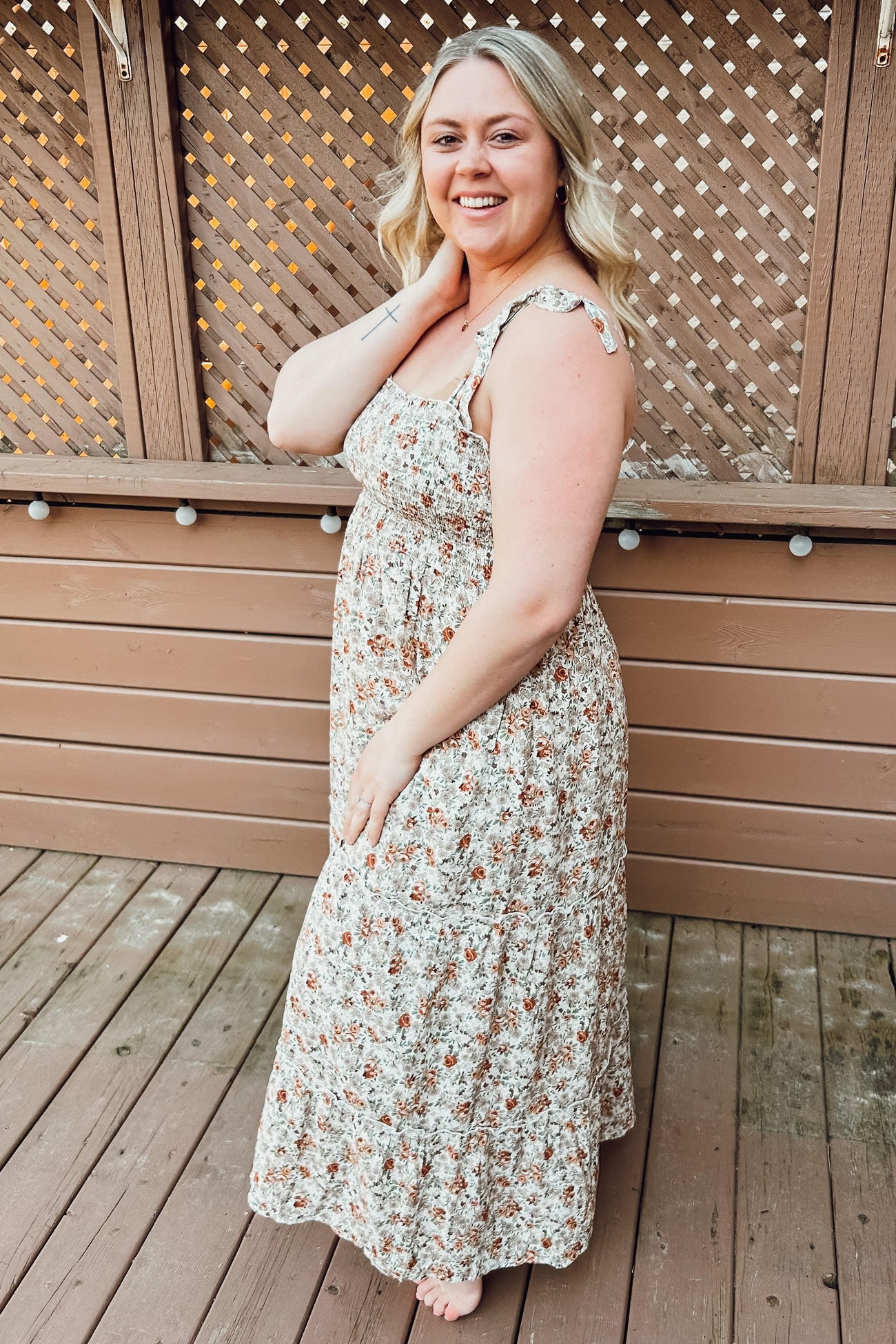 A floral sleeveless maxi dress featuring self-tie shoulder straps, a smocked top, a tiered skirt, side pockets and a square neckline.