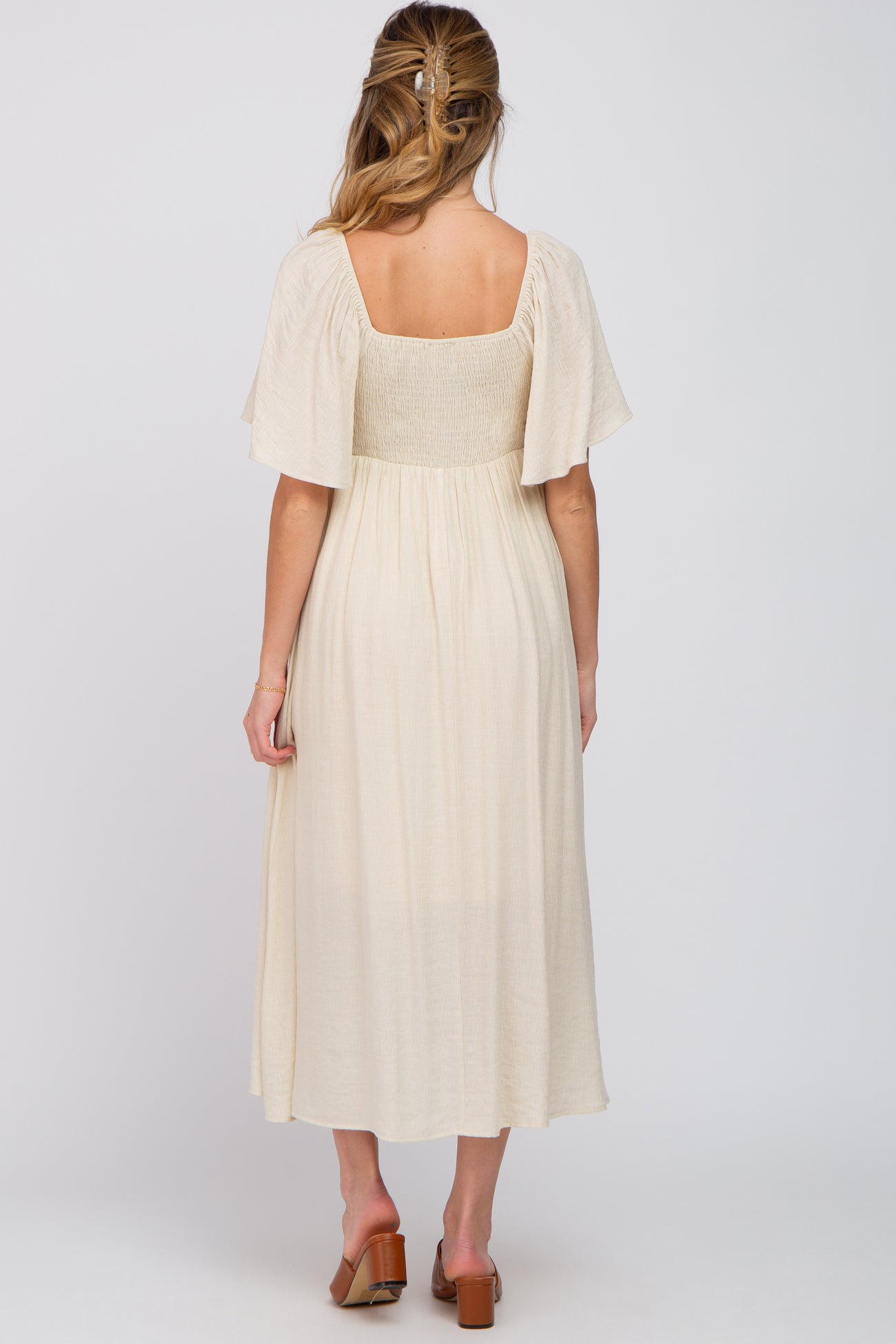 Beige Front Tie Ruffle Sleeve Maternity Midi Dress
