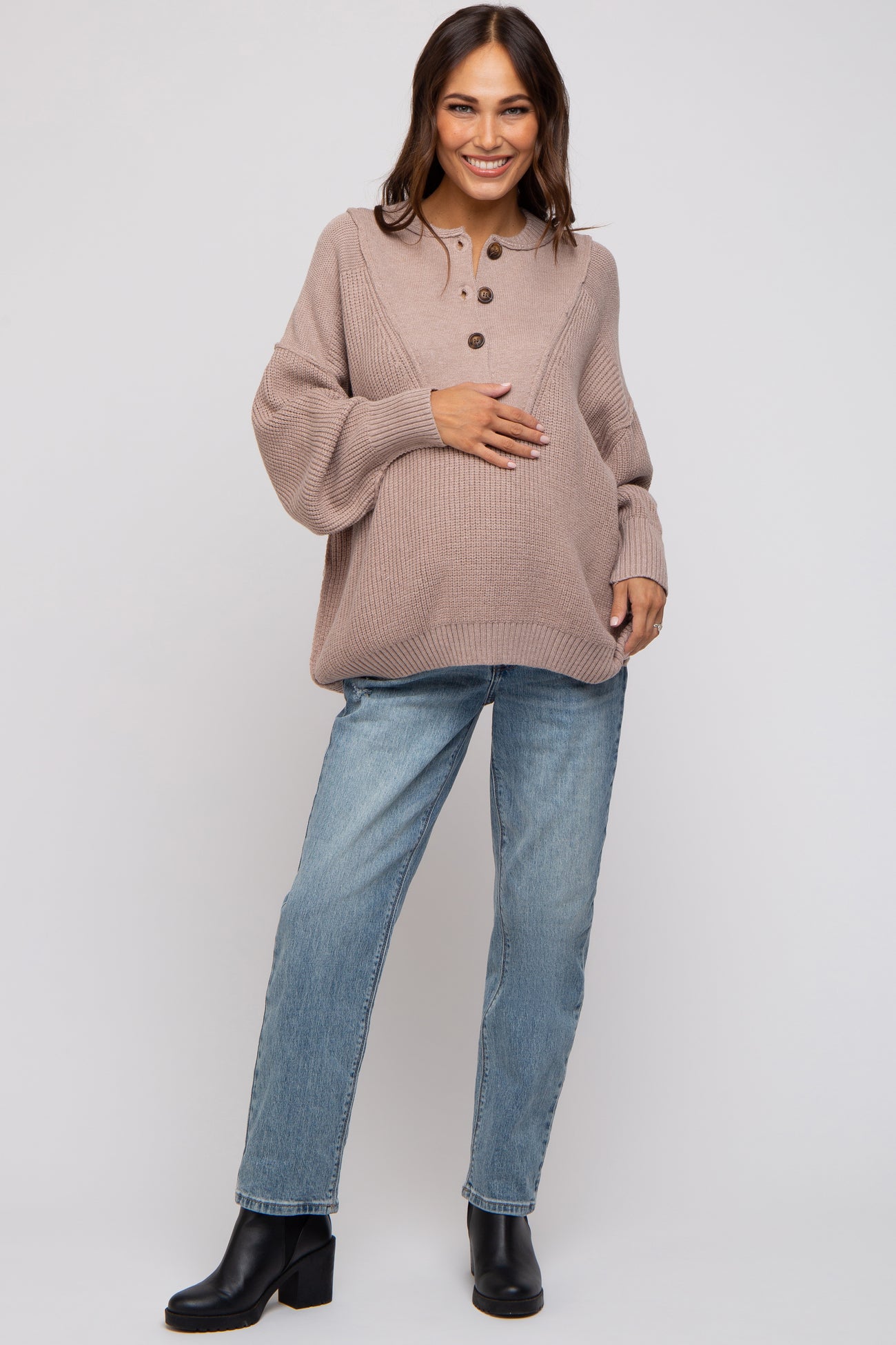 Beige Half Button Up Maternity Sweater