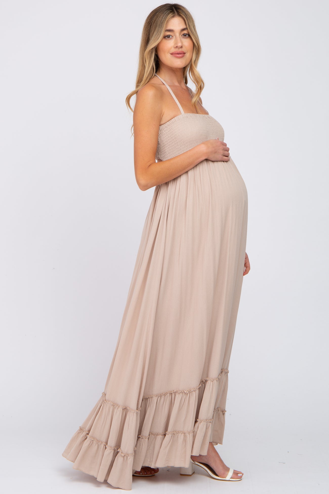 Beige Halter Neck Cut Out Maternity Maxi Dress
