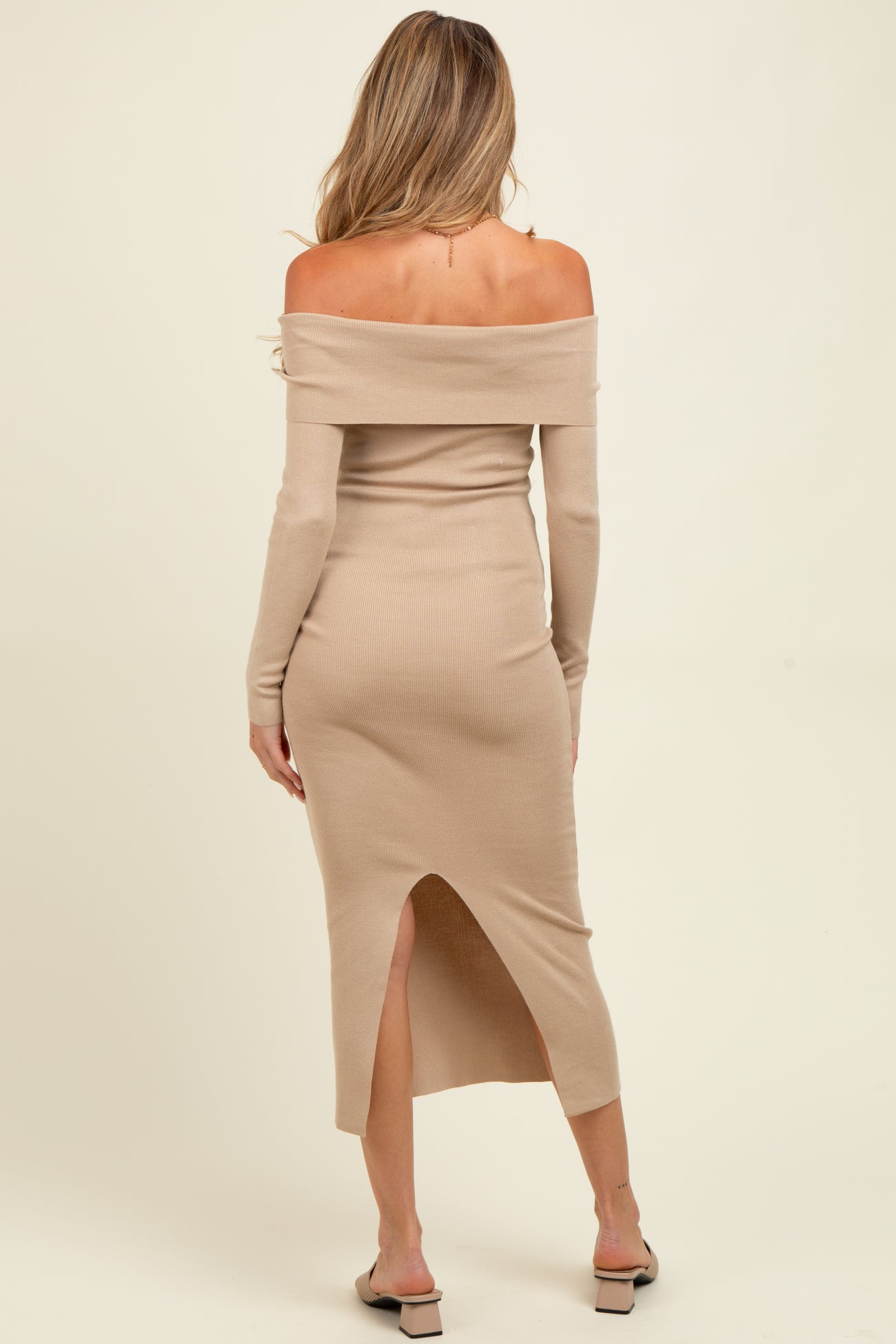 Beige Knit Off Shoulder Long Sleeve Maternity Midi Dress