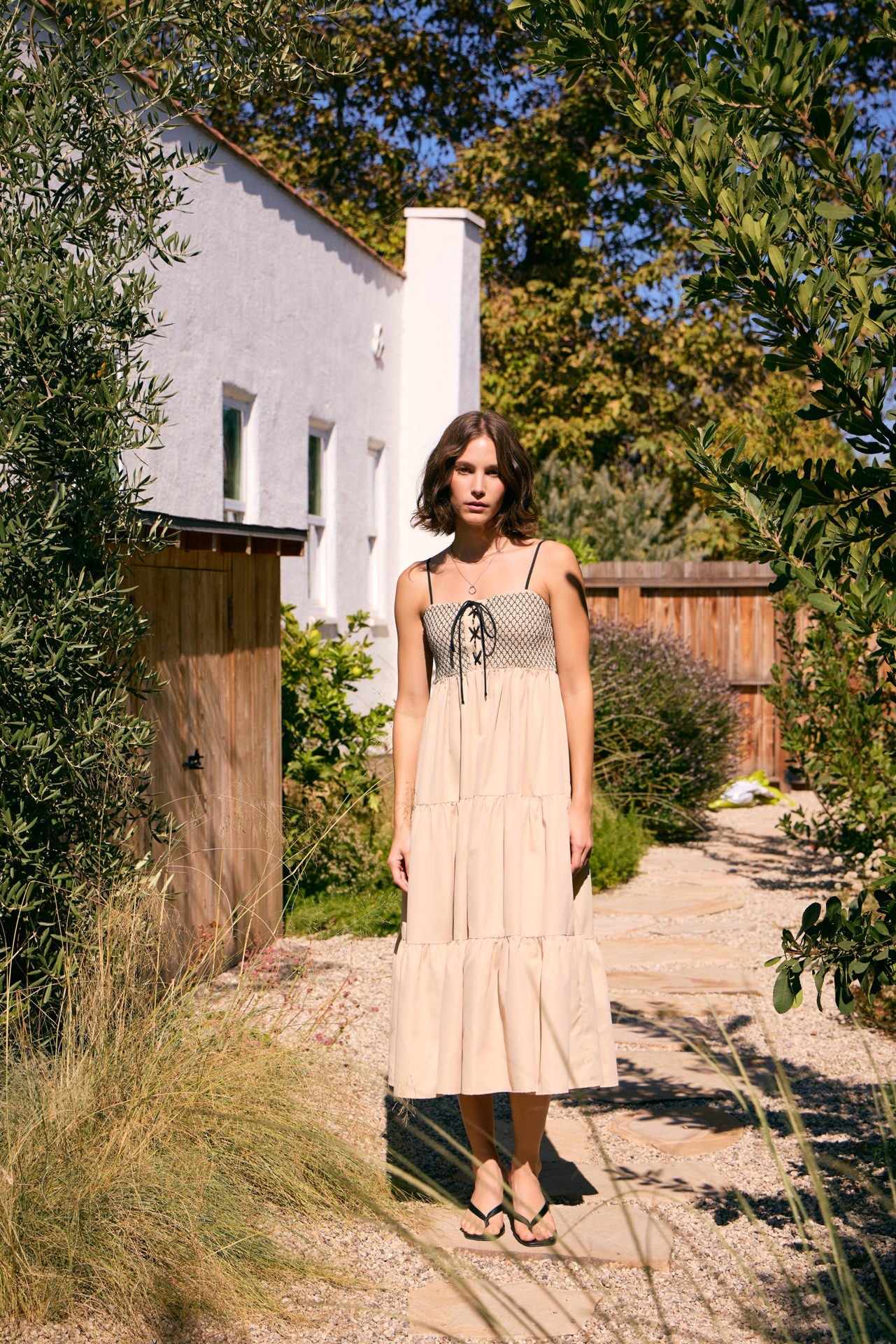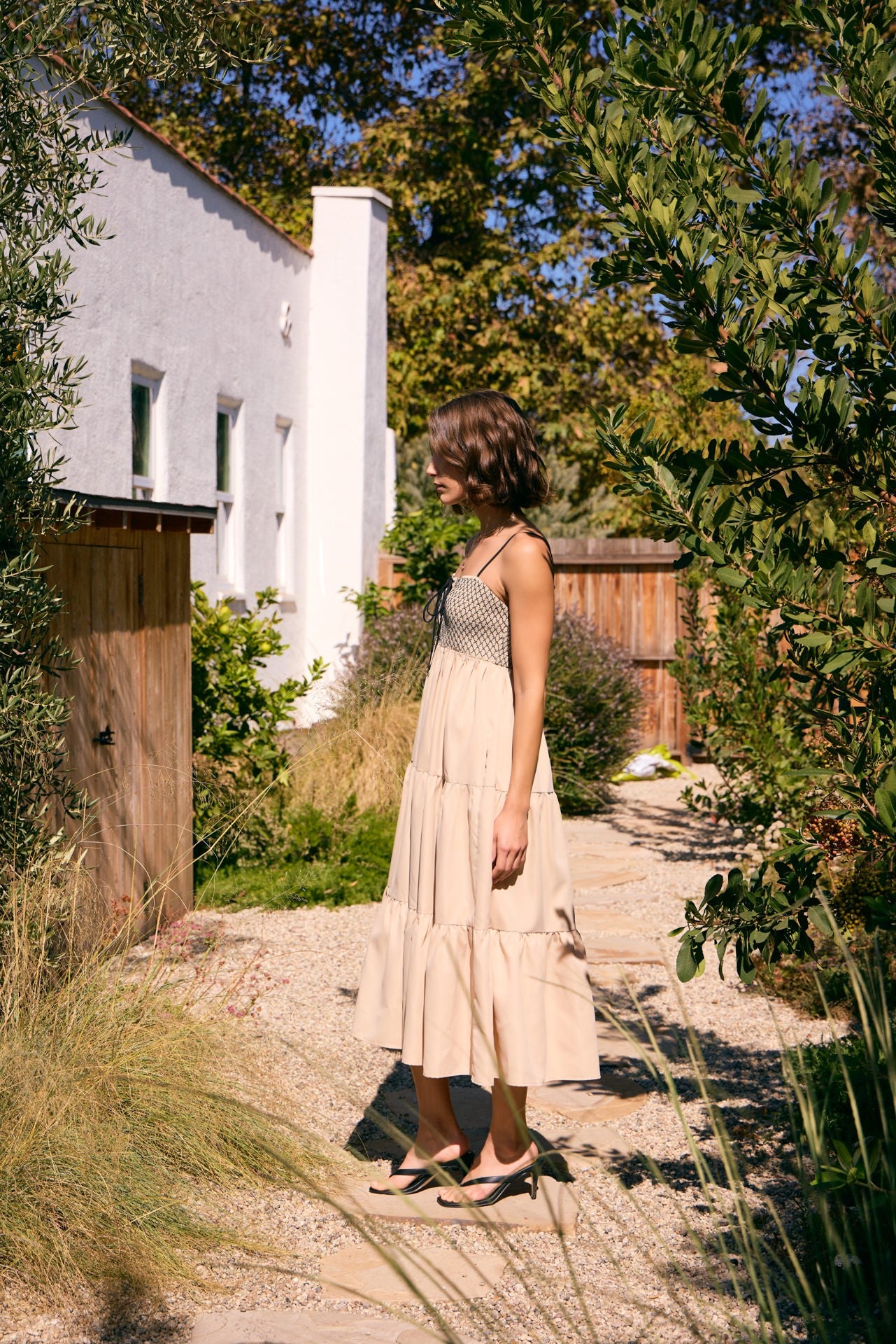 Beige Lace Up Smocked Bodice Tiered Midi Dress