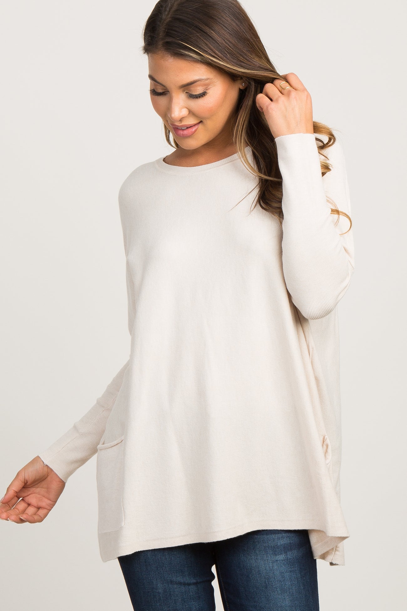 A solid knit maternity top featuring two front pockets, dolman long sleeves with ribbed cuffs, and a rounded neckline.