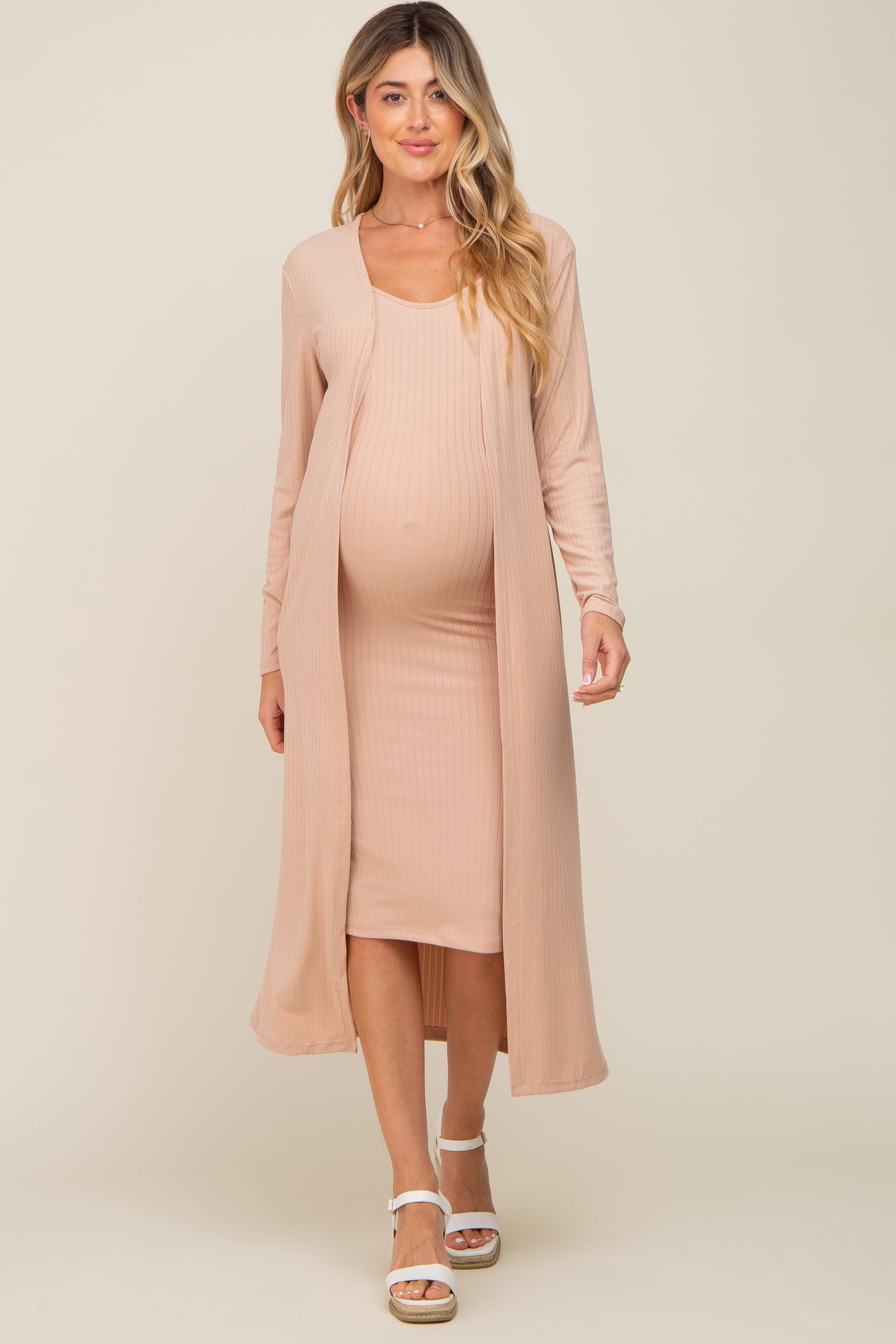 Beige Ribbed Cardigan 2 Piece Maternity Set