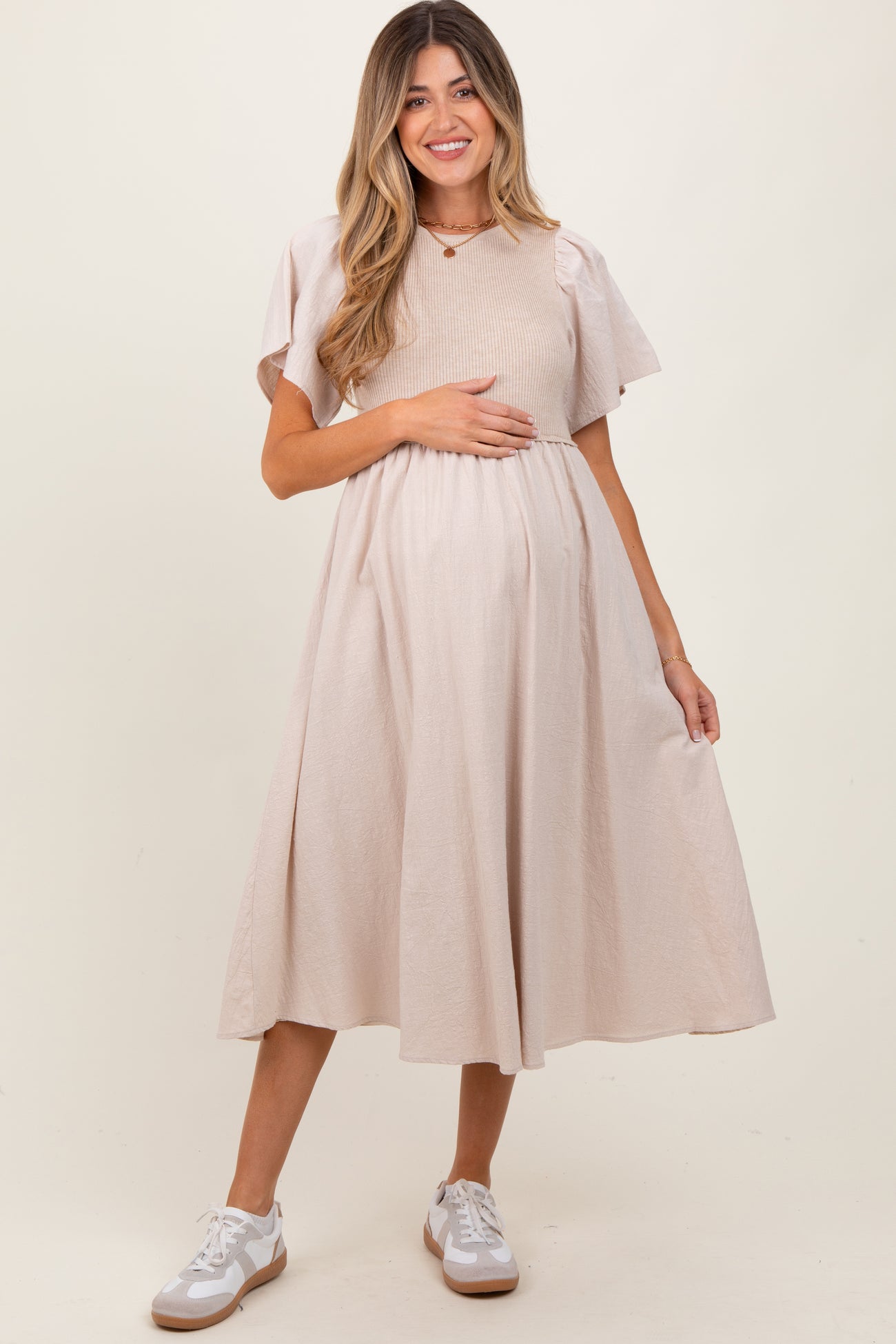 Beige Ribbed Knit Contrast Top Maternity Midi Dress
