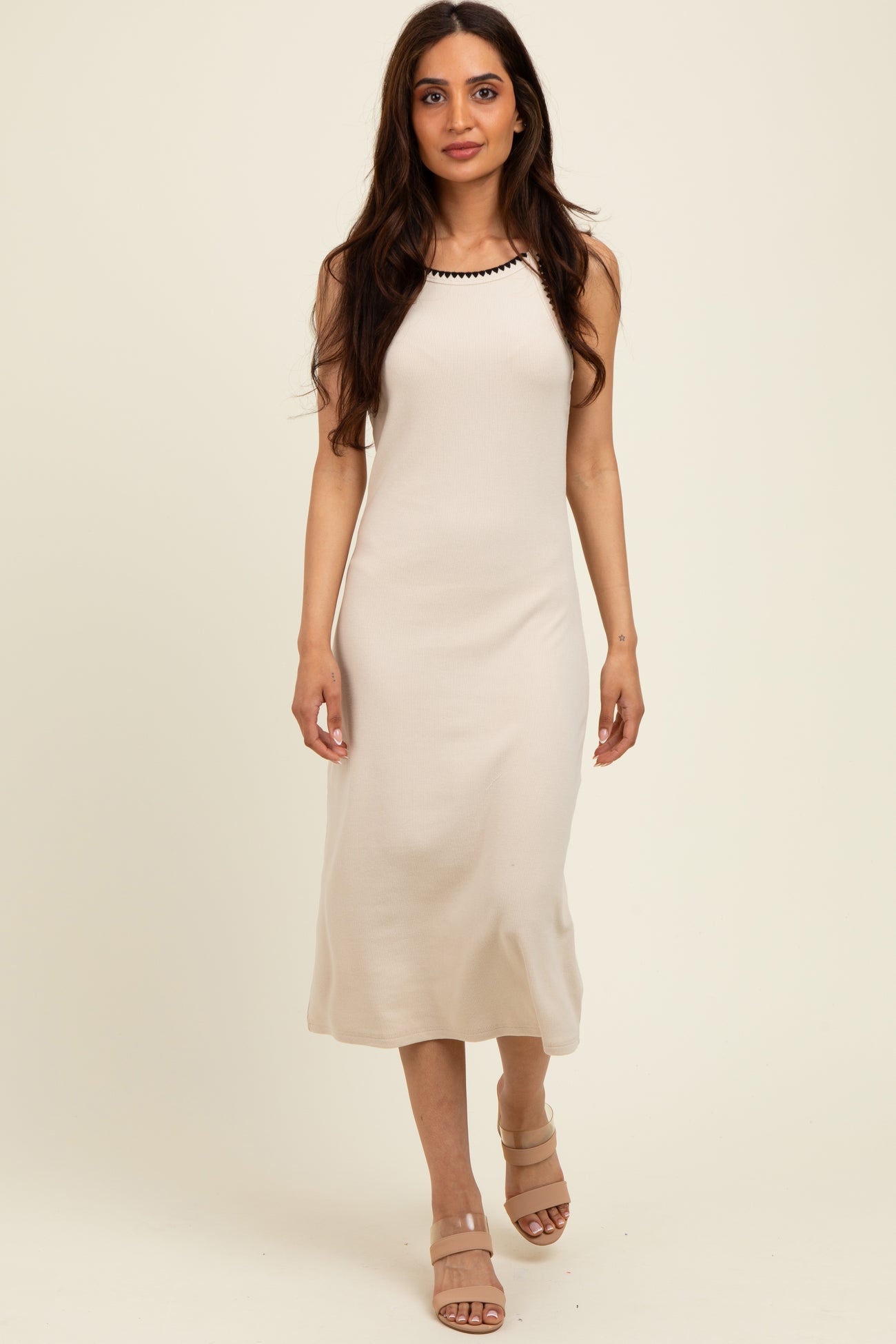 Beige Ribbed Knit Embroidered Maternity Midi Dress