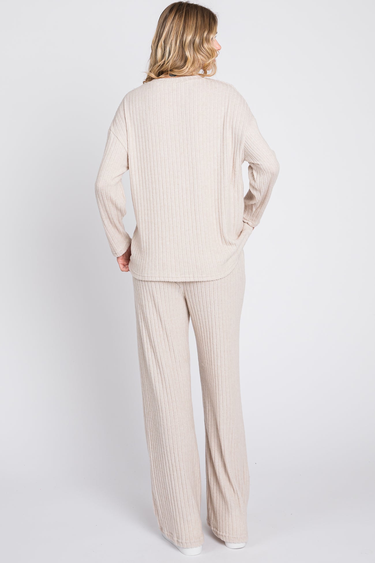 Beige Ribbed Soft Knit Long Sleeve Pajama Set