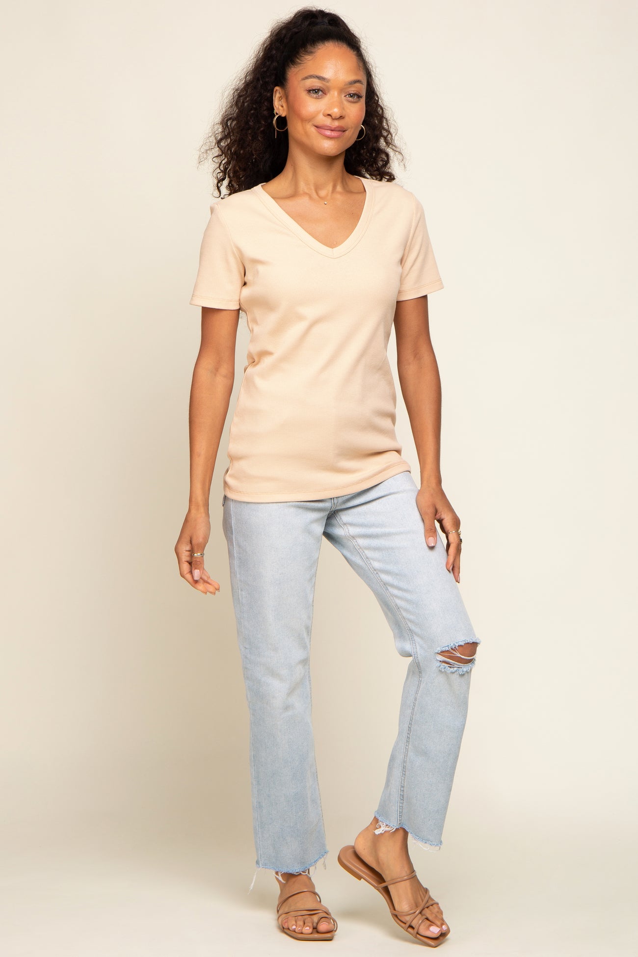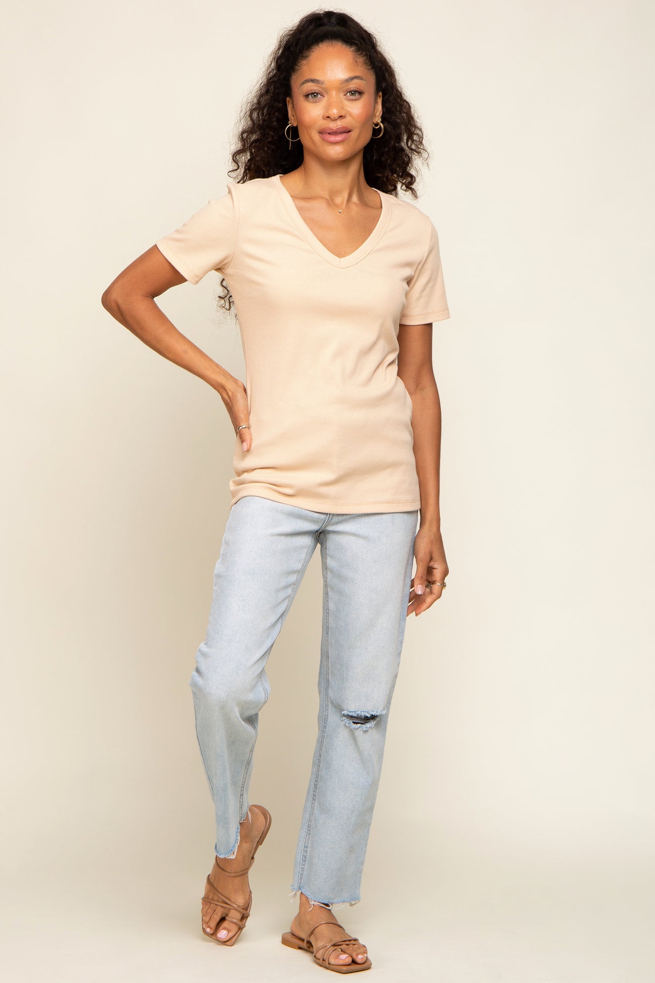 A ribbed fitted top featuring short sleeves and a v-neckline.