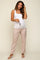 A pair of satin maternity pants featuring an elastic waistband, a button and zipper closure and side pockets.