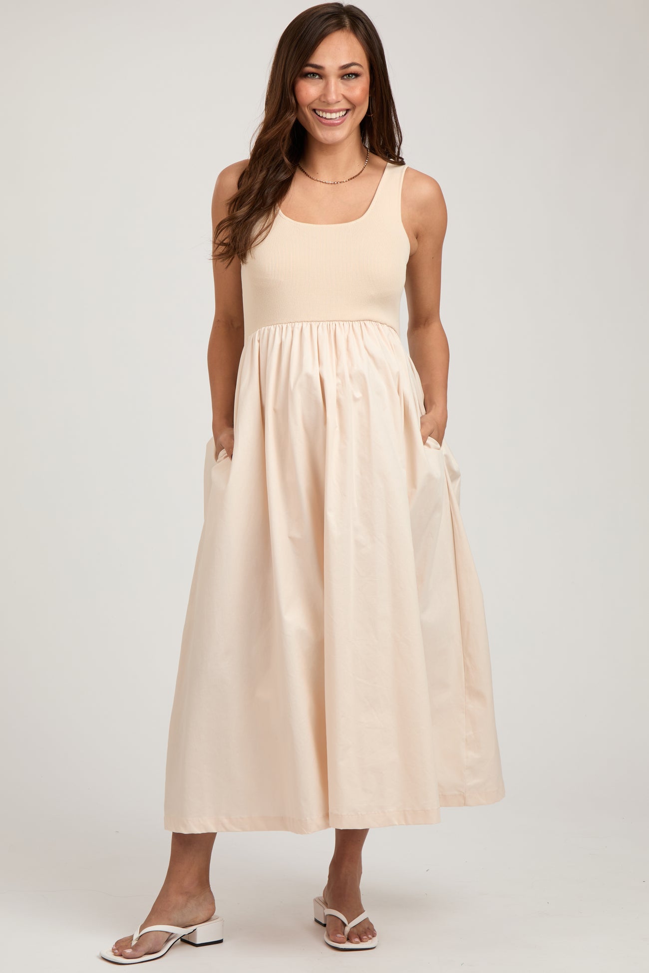 A maternity midi dress featuring a knit top and a cotton A-line skirt. Also features side pockets.