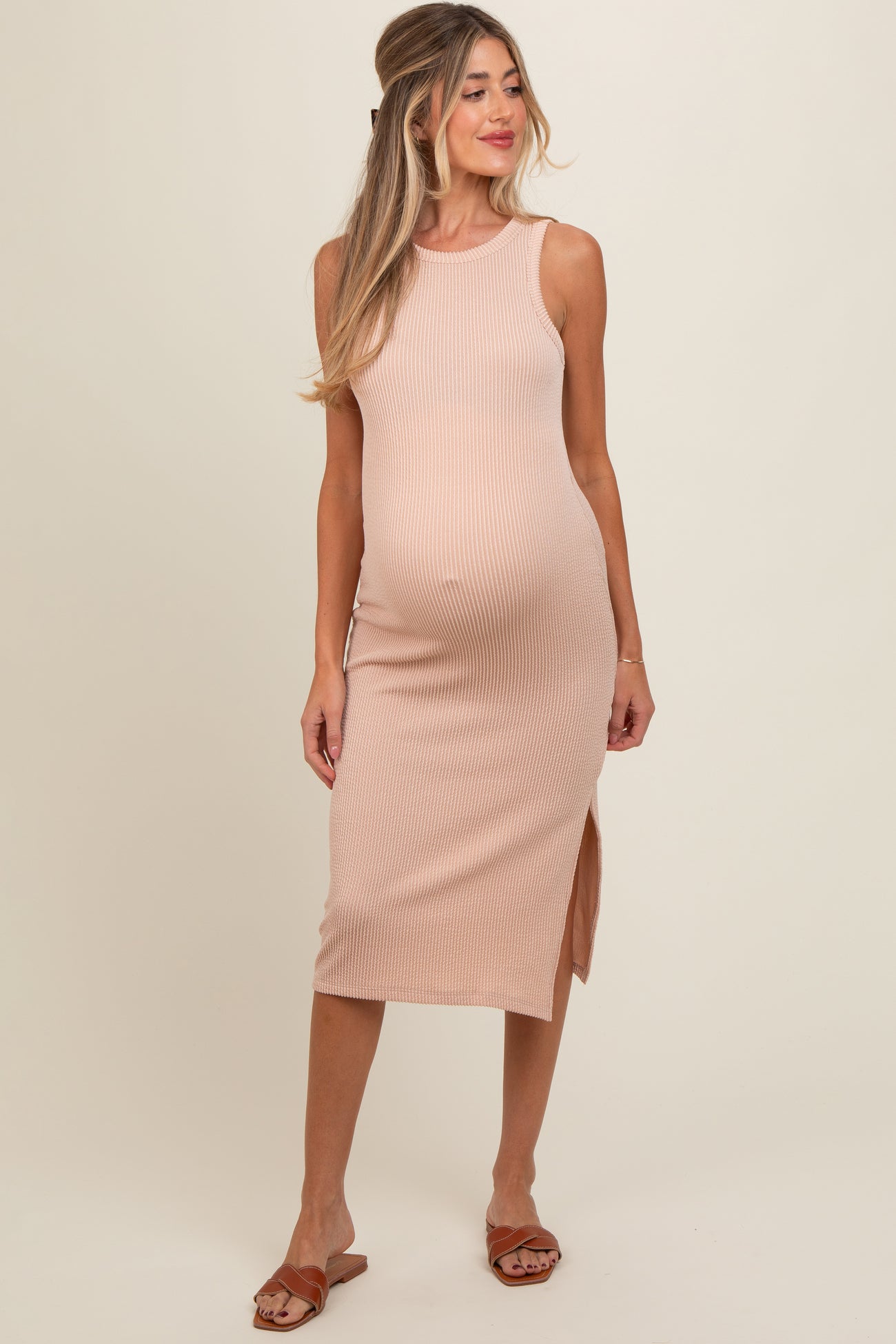 Beige Sleeveless Ribbed Maternity Midi Dress