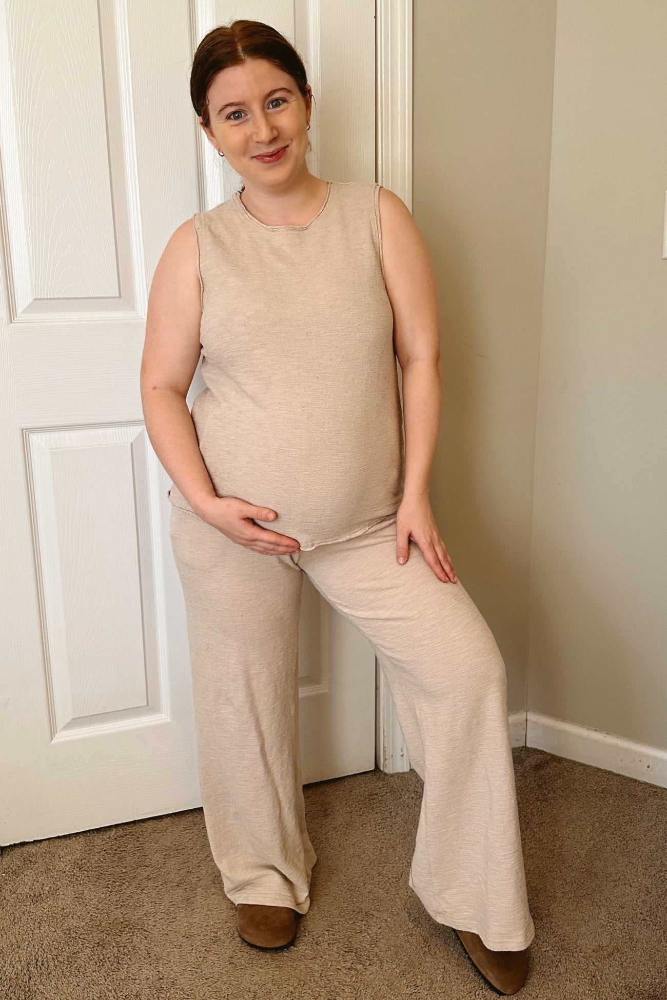 A solid maternity set with a sleeveless tank with raw edge detail and pants with pockets and elastic waistband.