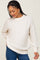 A soft knit sweater with a ribbed neckline, sleeve cuffs, and bottom hem. Features exposed seams on the long drop shoulder seams.