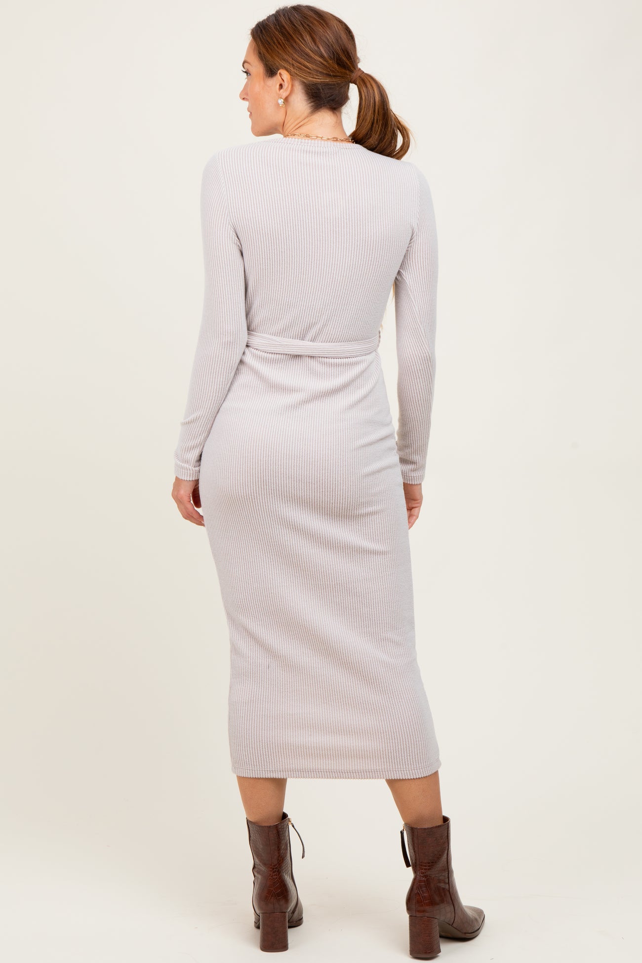 Beige Solid Brushed Rib Long Sleeve V-Neck Fitted Midi Dress