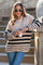 A striped knit maternity sweater featuring a rounded neckline and long sleeves.