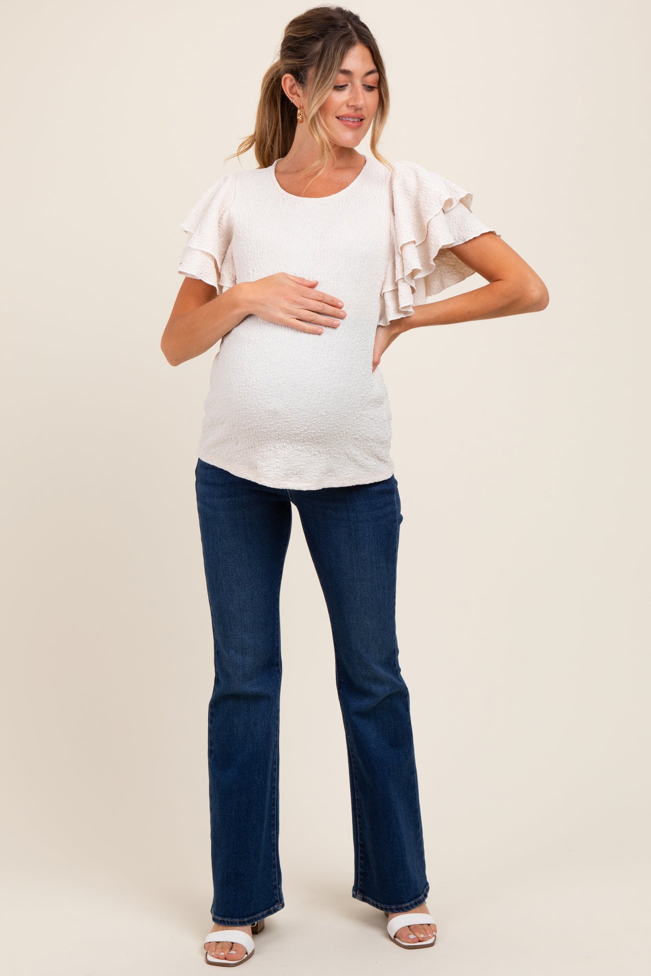 Beige Textured Ruffle Sleeve Maternity Top