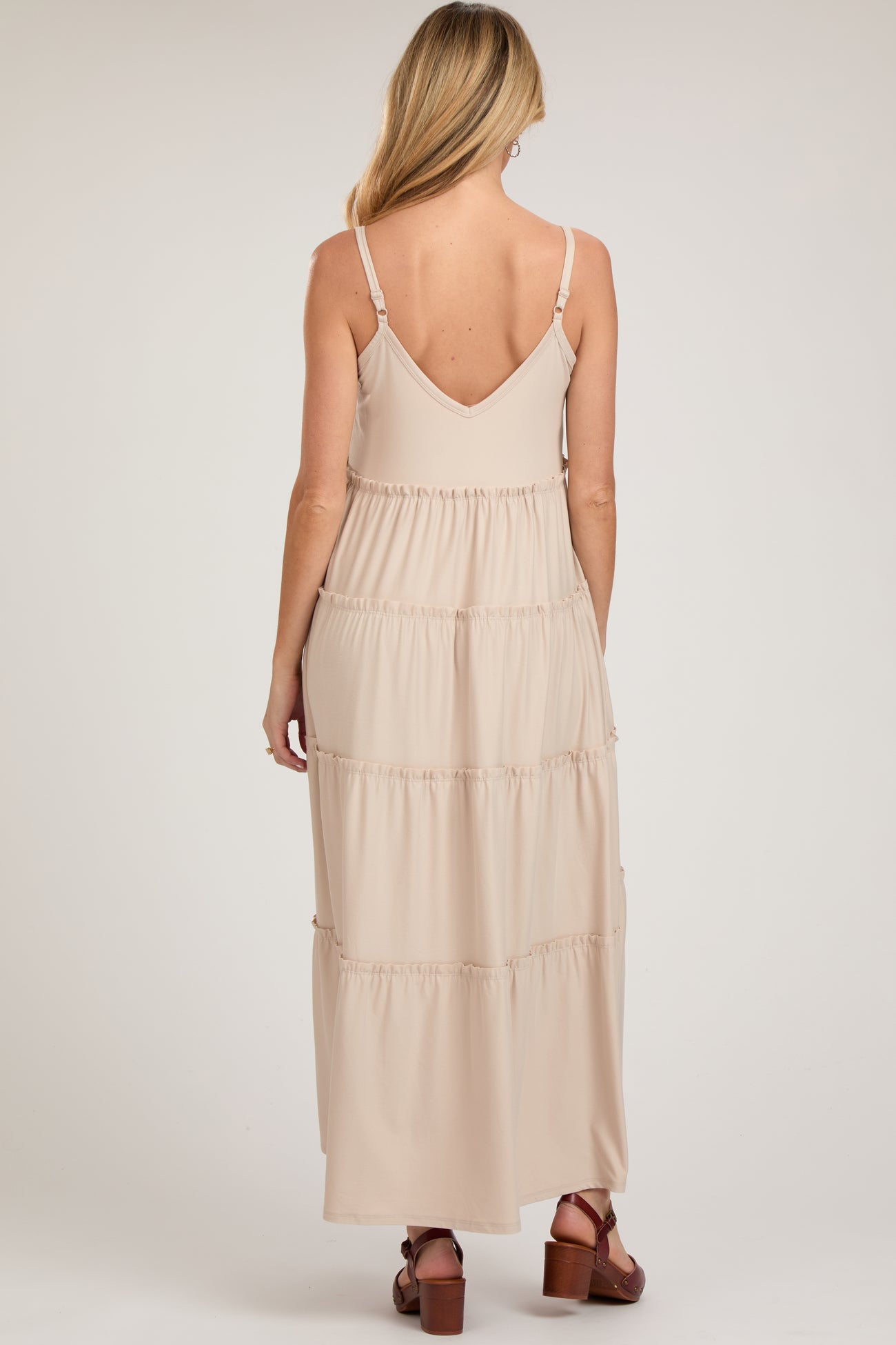 Beige Tiered Sleeveless Maternity Maxi Dress