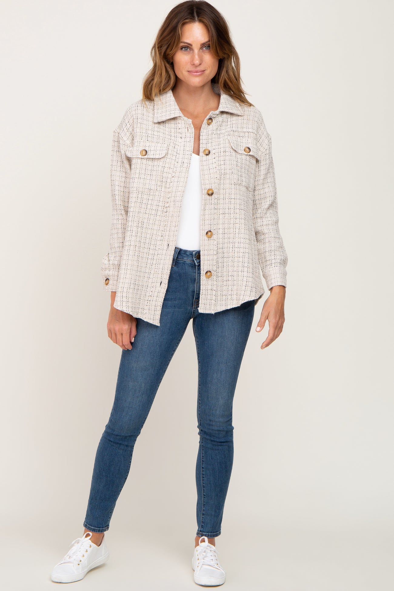 A tweed shacket featuring a collar, long cuffed sleeves, front buttons, two front pockets, two side pockets, and a rounded hem.