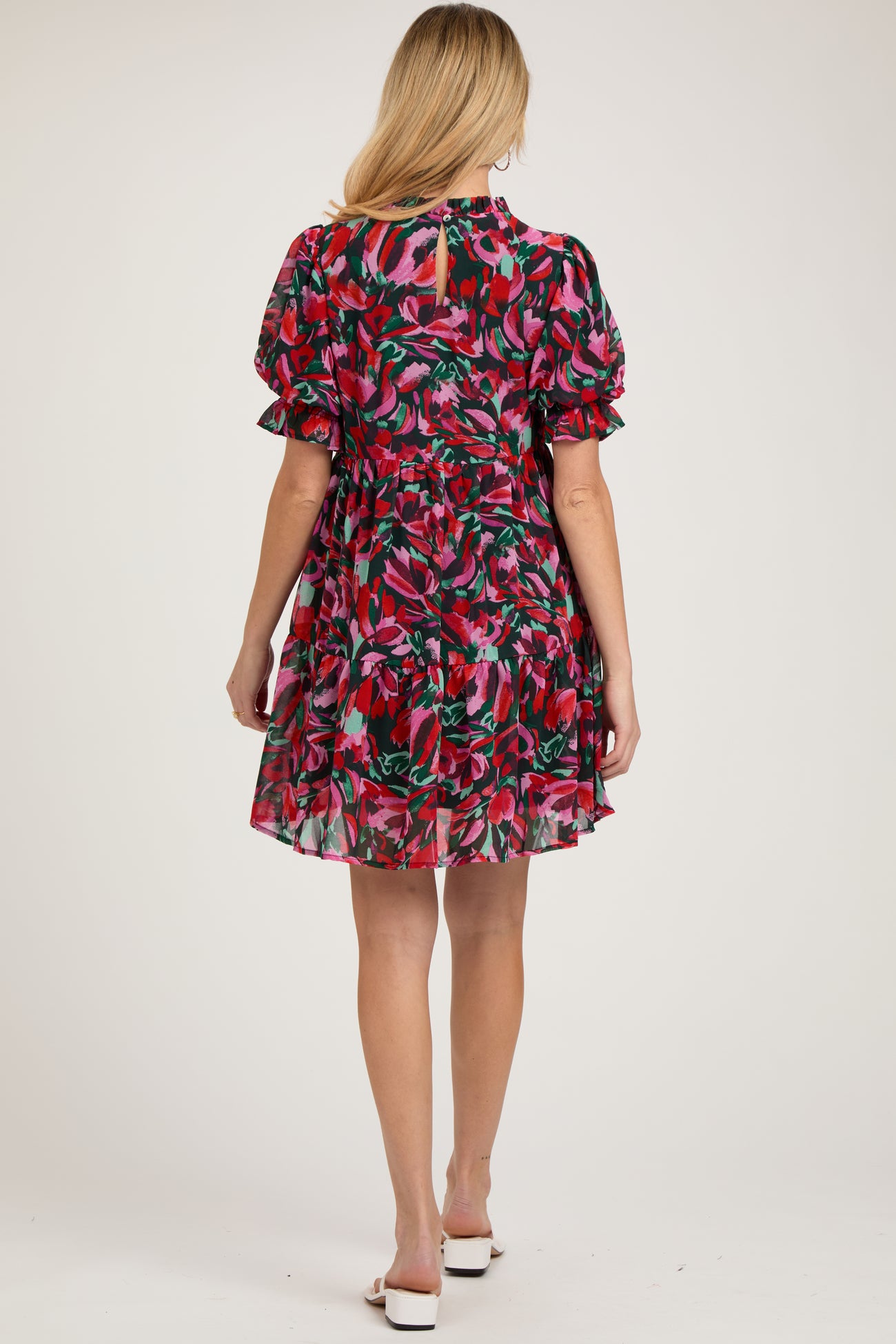 A printed maternity dress with a rounded ruffle trim neckline, short puff sleeves, a back keyhole button closure, and a tiered skirt. Dress is fully lined.