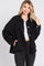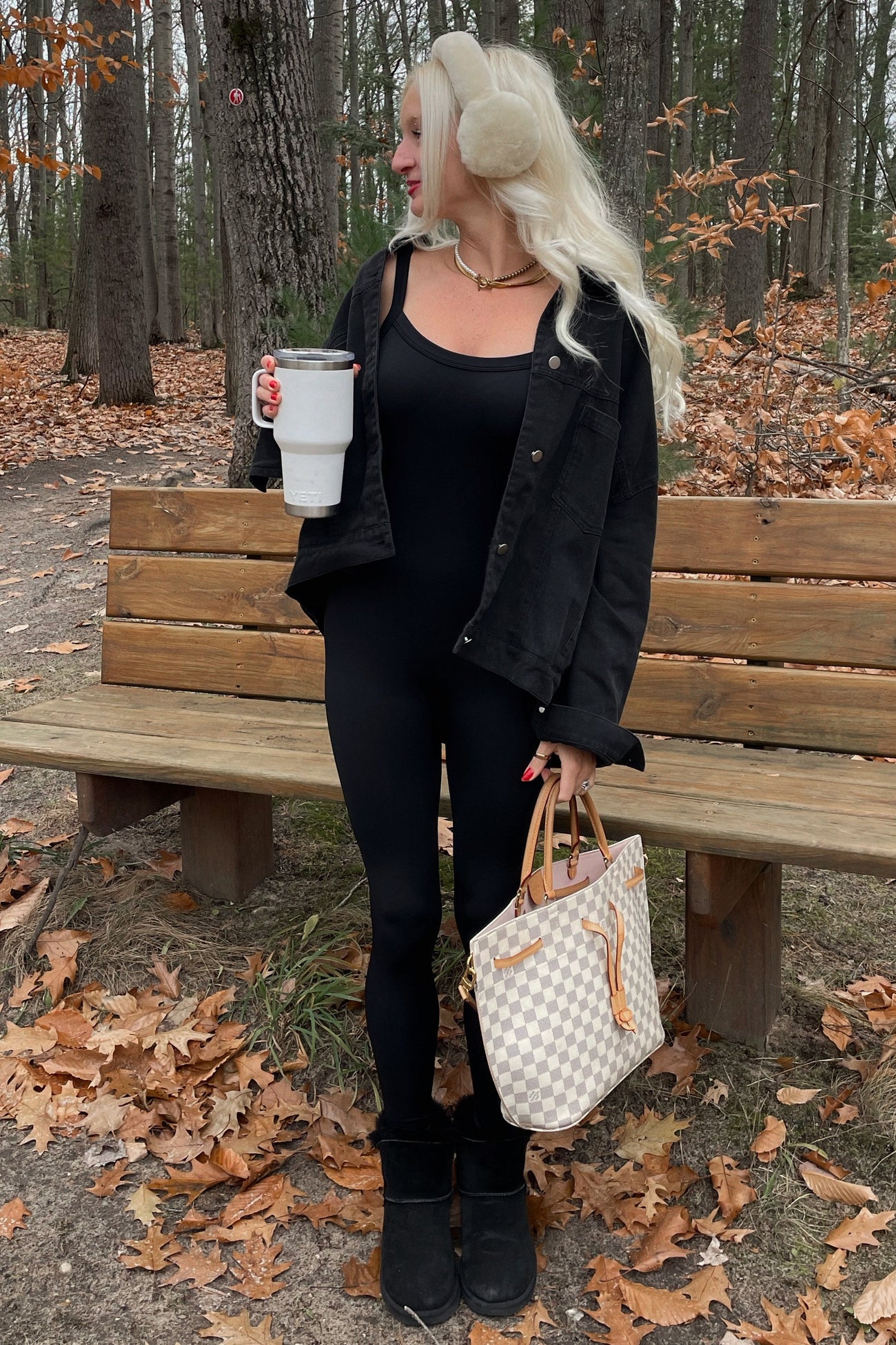 A solid denim jacket with a collared neckline, two front chest pockets, two side pockets and button down front.
