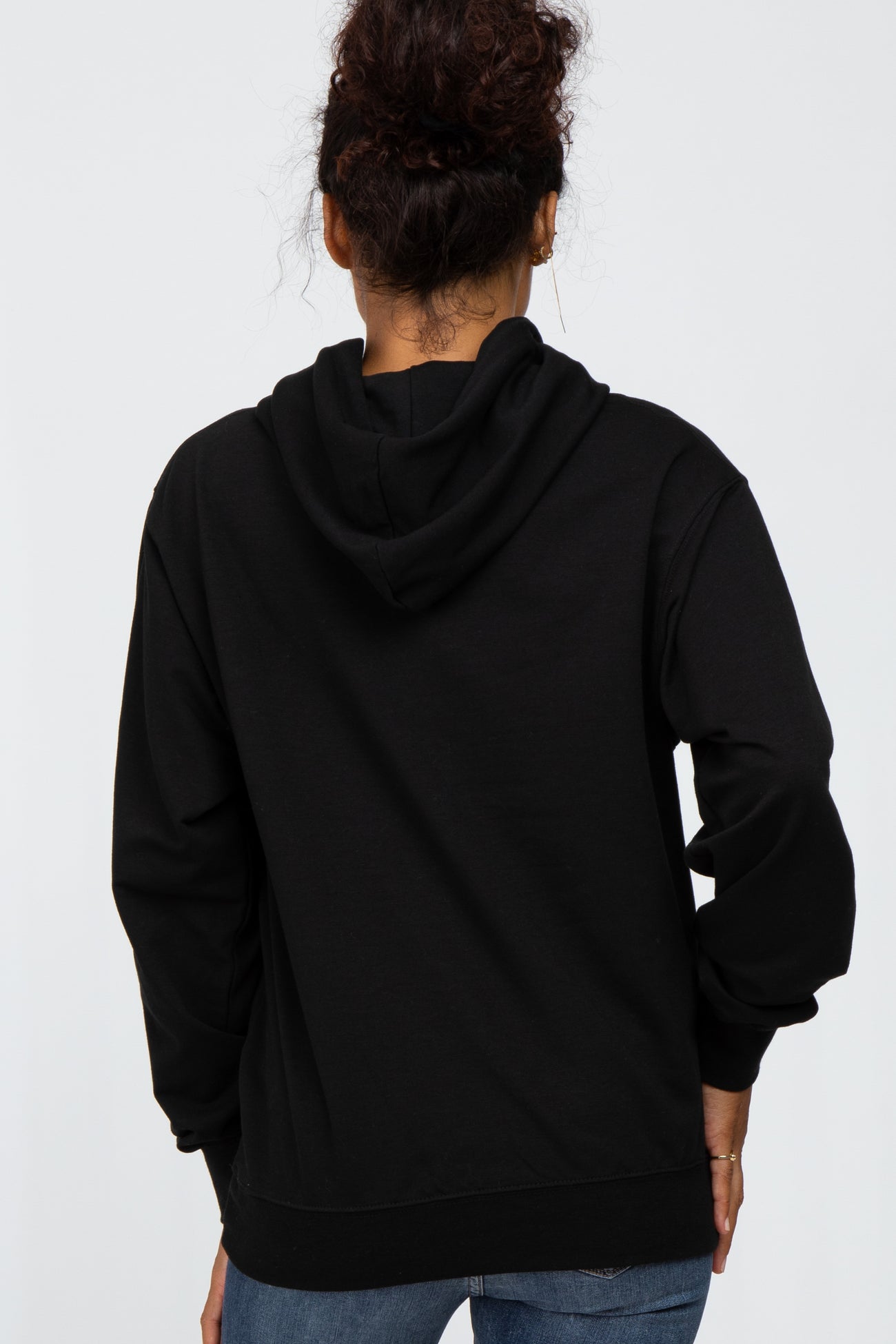 A long sleeve sweatshirt with drawstring hood and kangaroo pocket. Banded hemline and sleeves.