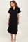 A solid hue midi dress with a collar, front pocket, functioning front buttons, short dolman sleeves, side slits, and a rounded hem.