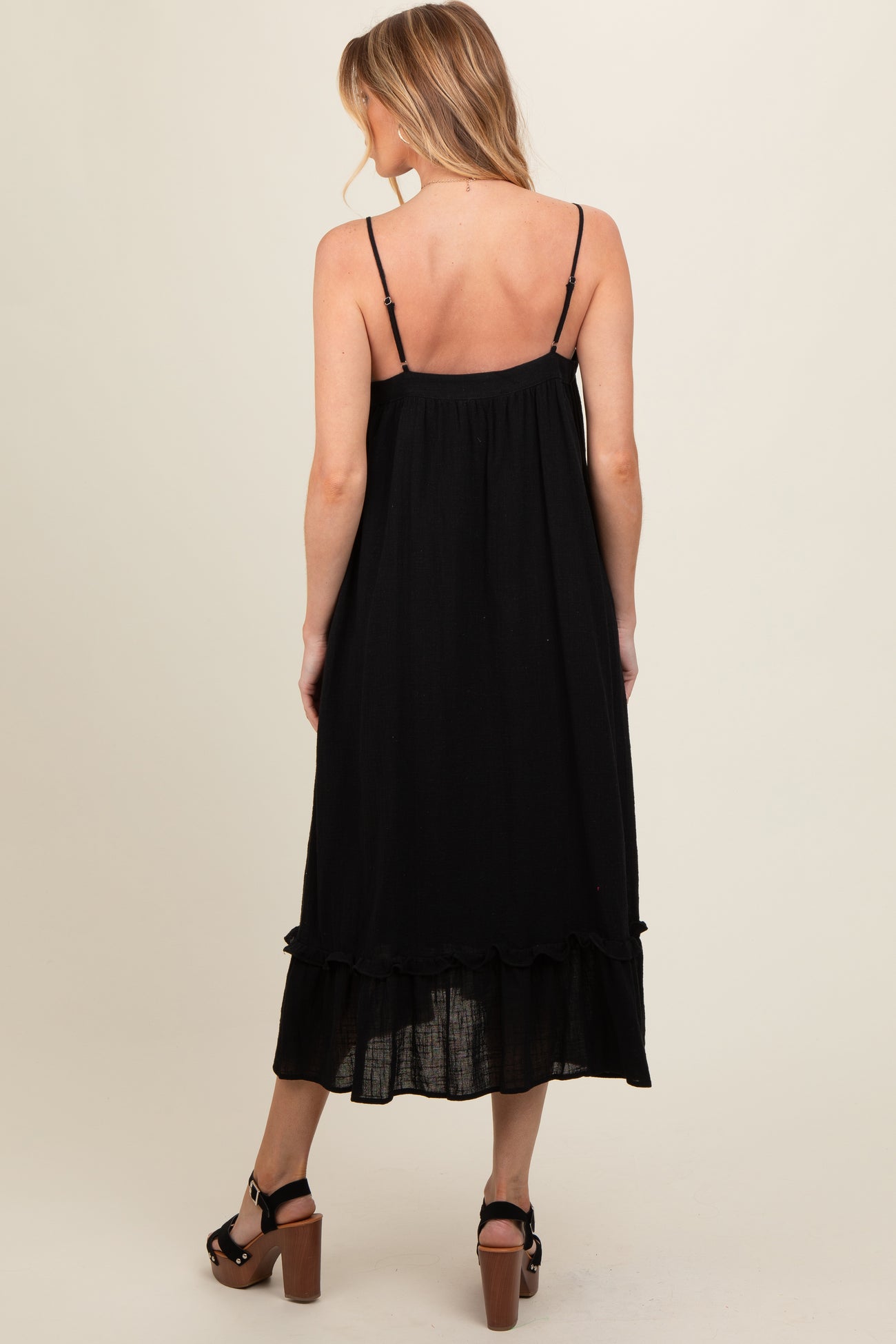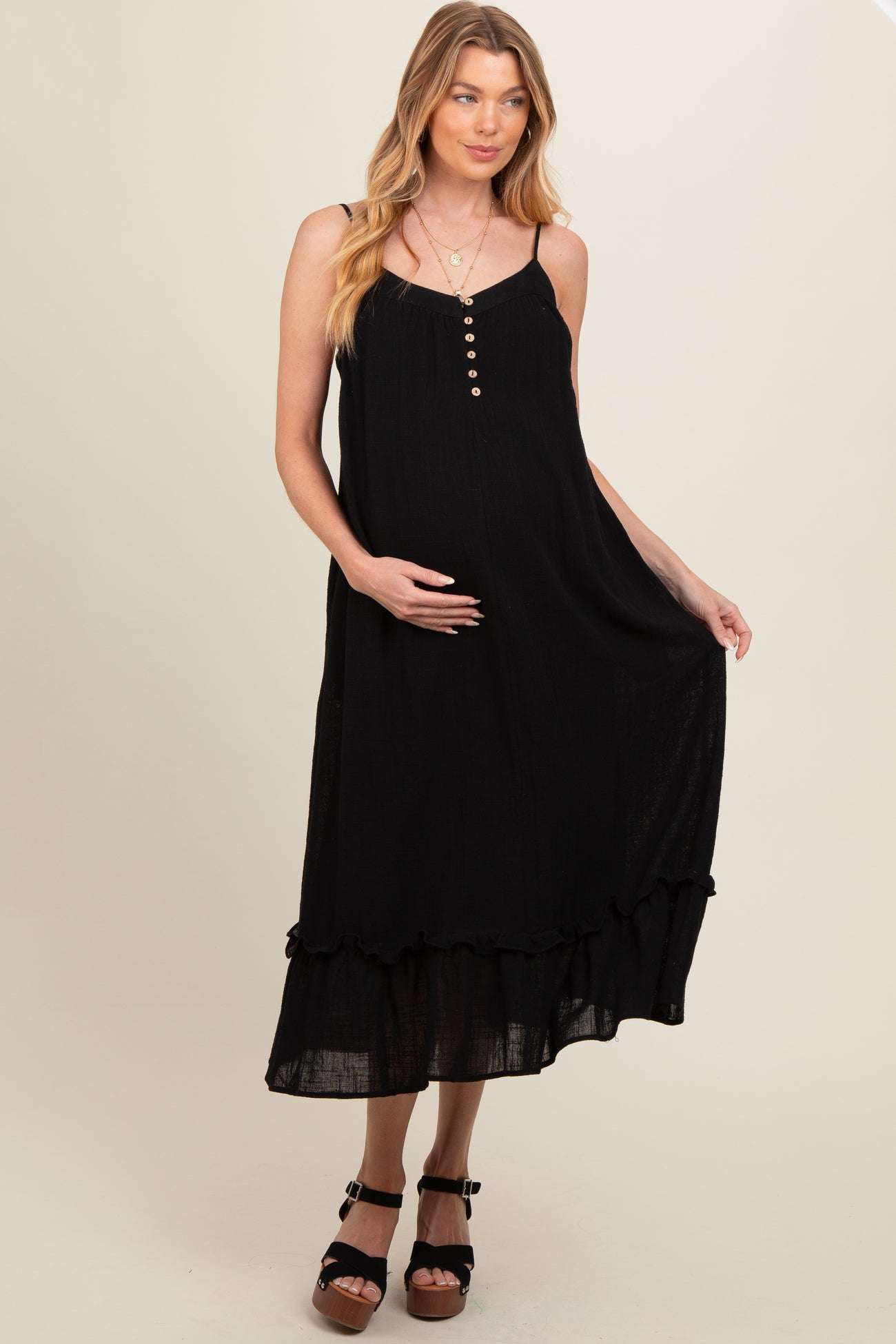 Black Button Front Pocketed Maternity Midi Dress