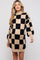 A checkered knit maternity sweater dress featuring a mock neckline, long sleeves and a ribbed trim.