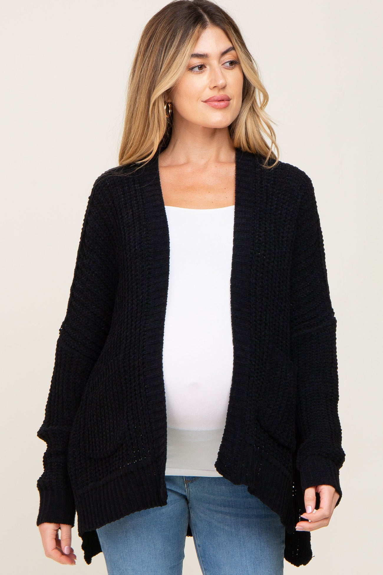 A super soft chunky knit maternity cardigan in an oversized fit with an open front, two front pockets and two side slits.