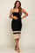 A ribbed knit maternity fitted midi dress with colorblock stripe detail. Includes adjustable straps.