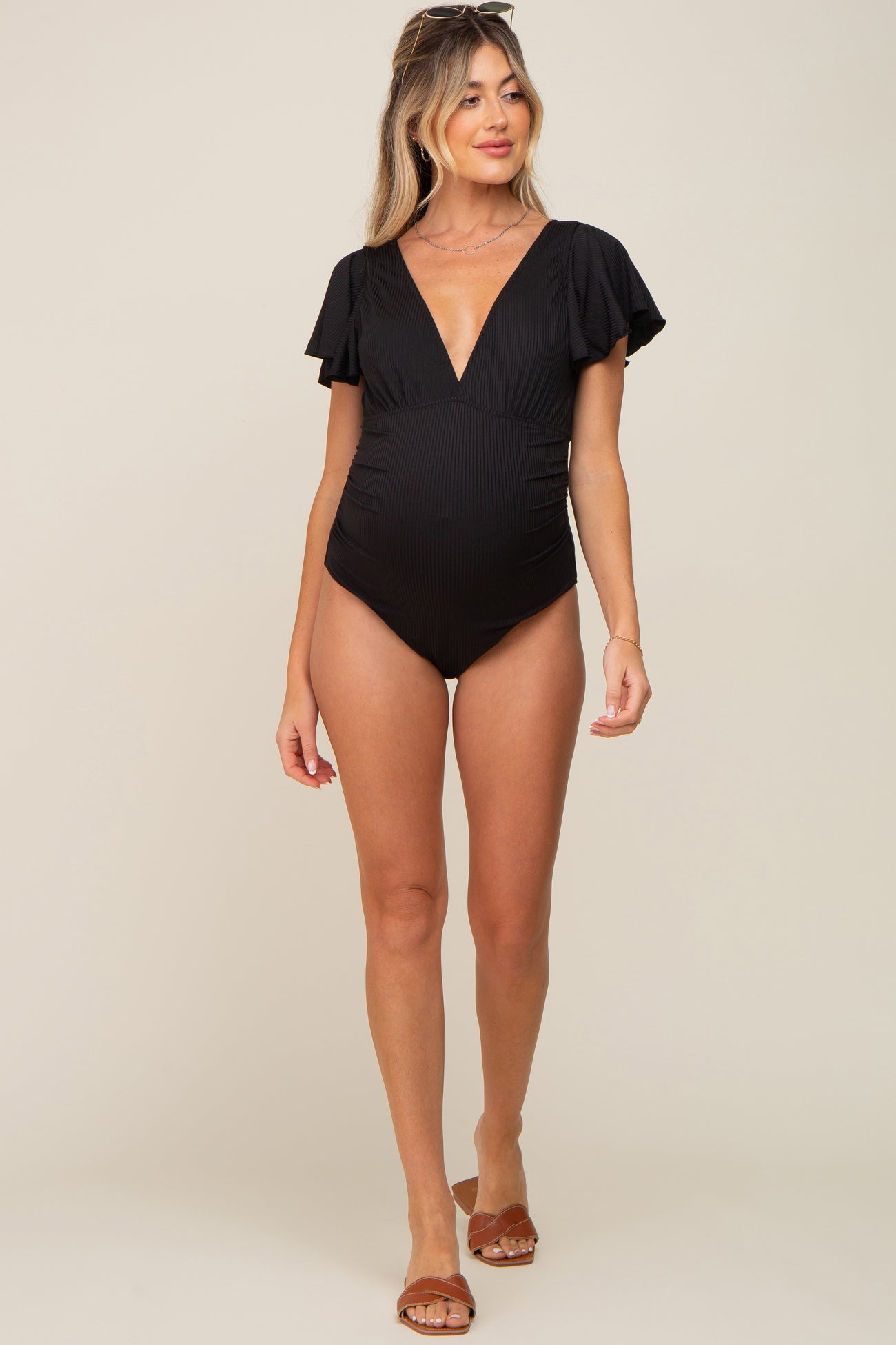 A ribbed maternity one piece swimsuit. Features a deep v-neckline, short flounce sleeves, ruched sides, and removable padding at the bust.