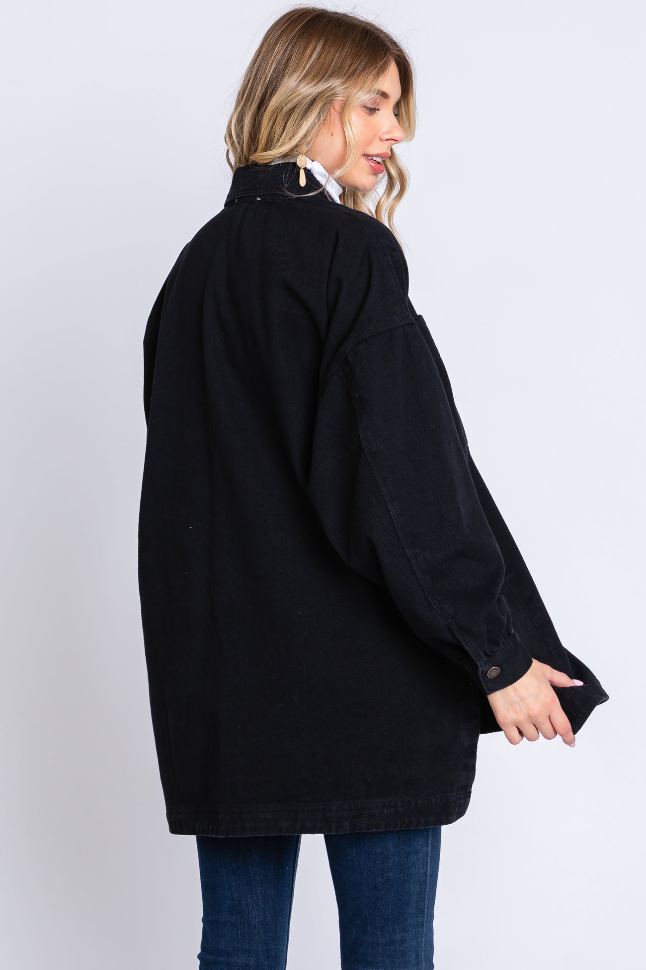 A denim jacket featuring a collared neckline, long sleeves with a button closure, front buttons, four front pockets, a side slit and a hi-low hem.