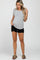 A pair of solid maternity jean shorts with heavy distressing, fringe hem, five pockets, and full panel elastic bellyband. Material has high stretch.