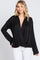 A top with a draped wrap front, a collar, and a long sleeves with slits.