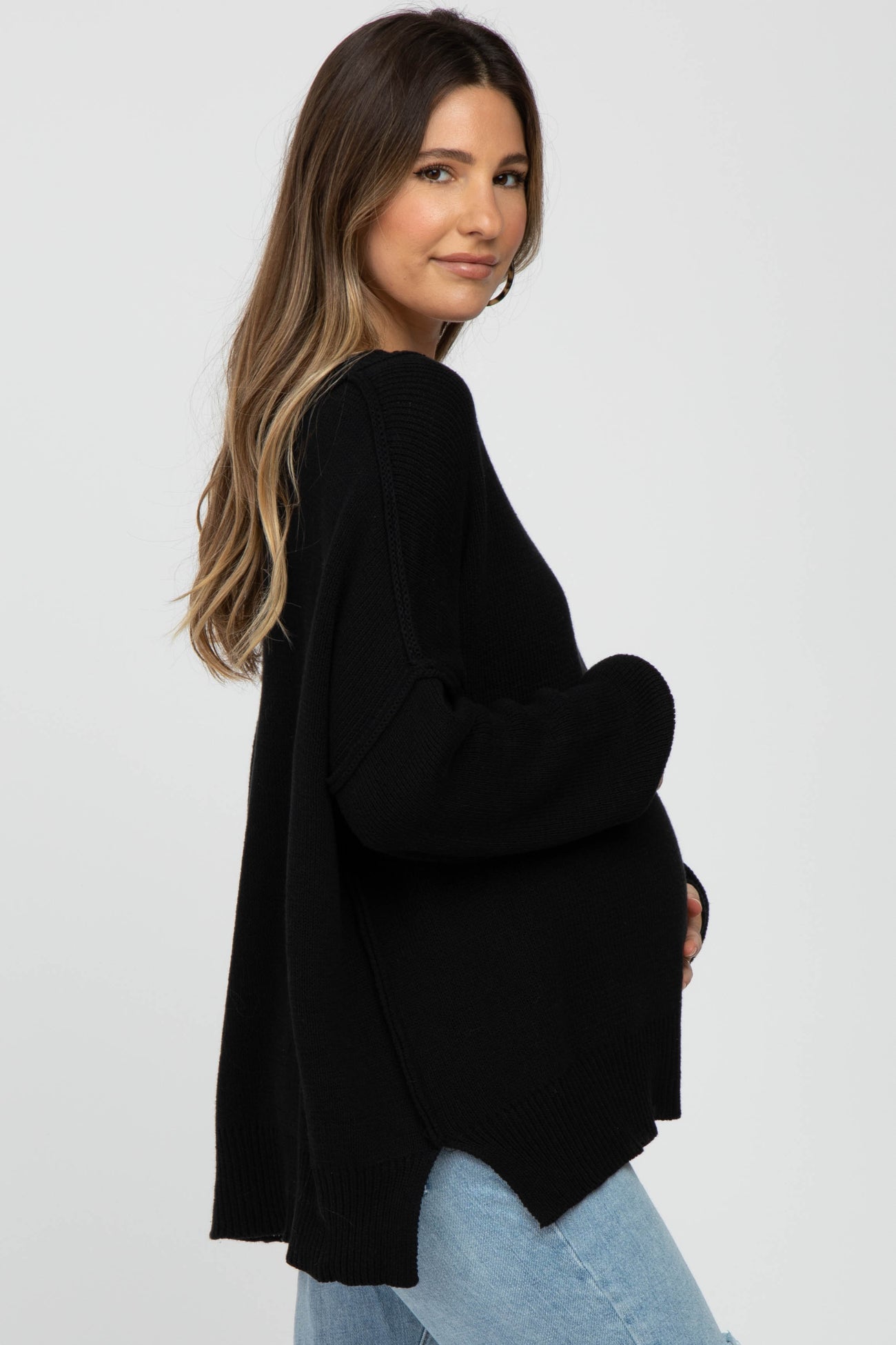 A maternity sweater featuring a crew neckline, ribbed trim, exposed seam detailing, long sleeves and side slits.