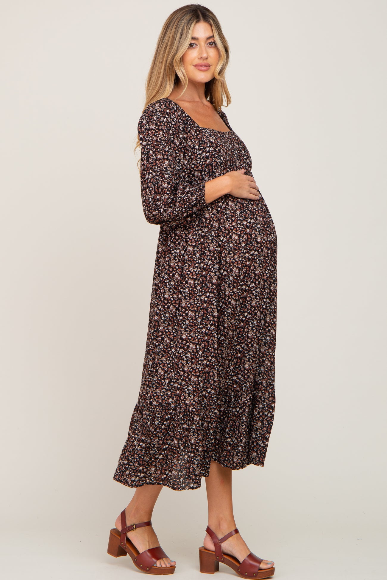Black Floral 3/4 Sleeve Maternity Midi Dress