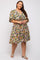 Details A floral knee length plus size dress. Features a v-neck wrap neckline, cinched 3/4 length sleeves, and a waist tie. Top front is lined. Content + Care