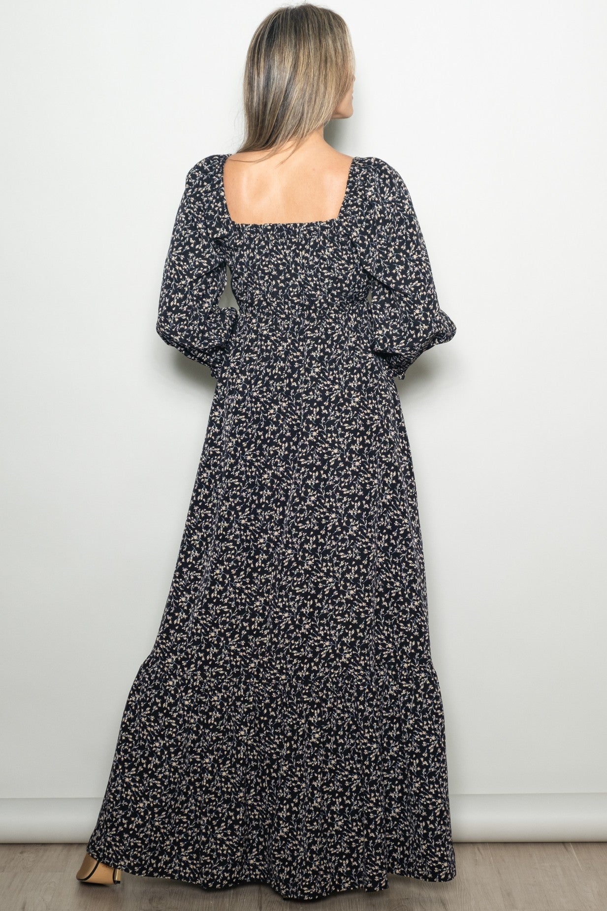 Black Floral Button Accent Long Sleeve Maxi Dress