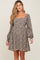A floral maternity dress with a square neckline, long semi sheer balloon sleeves, smocked sleeve cuffs, and a back zipper and tie closure. Body is lined.