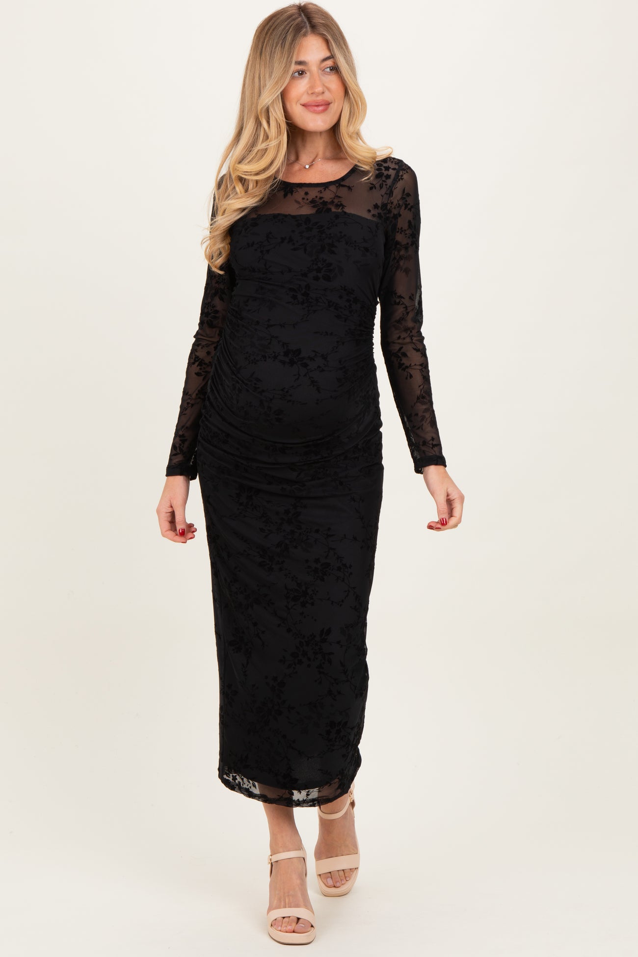 Black Floral Flocked Mesh Long Sleeve Maternity Midi Dress